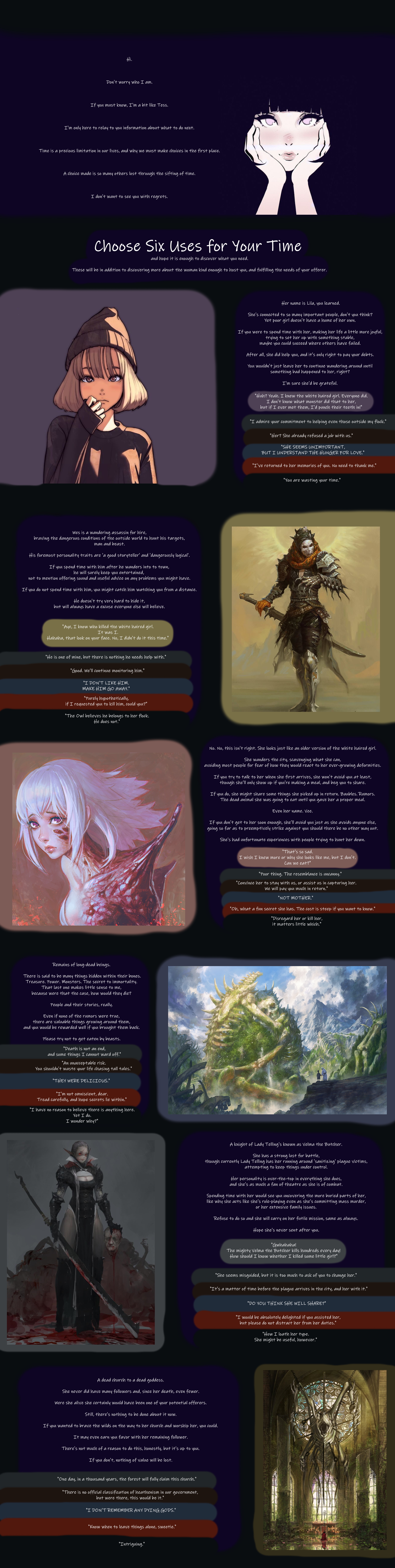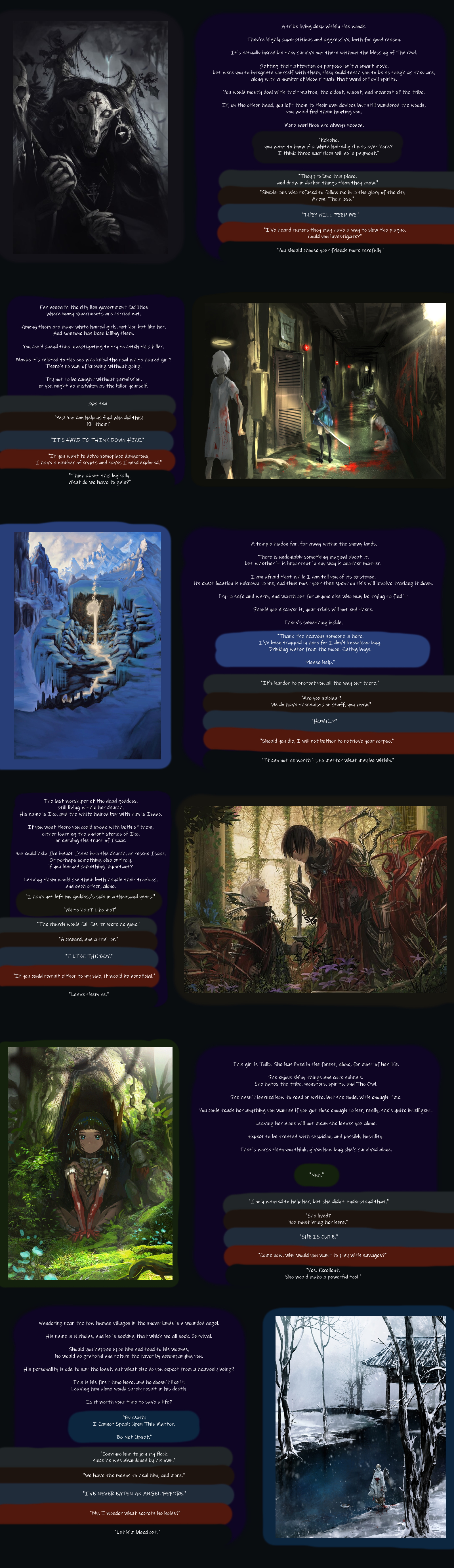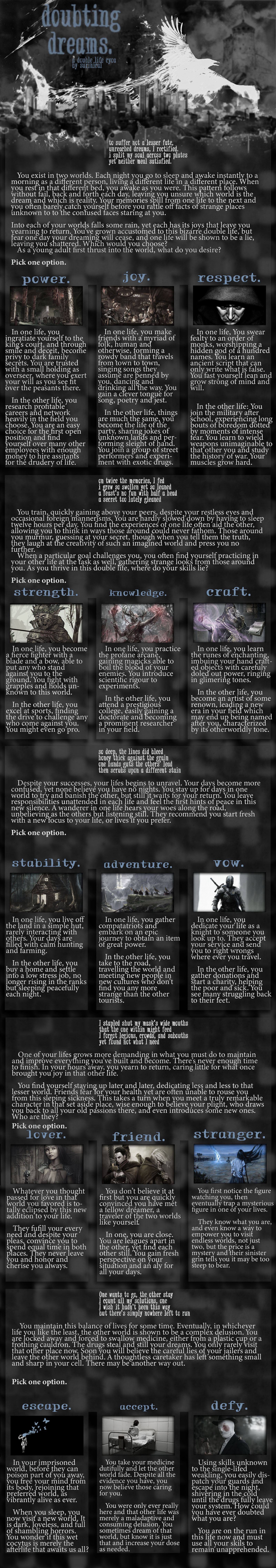 >>97520148Why are the most uniquely creative authors such lazy fucking assholes? They never finish a thing. This is one of the most aesthetic cyoa concepts I’ve come across and yet it’s probably just sitting there rotting away. When was the last time black magic received an update? Like five years ago? It’s the same with Liminal phrenic; they’re always dumping highly interesting WIPs and never a real finished product. Their ideas rarely go anywhere. Like their Alice in Wonderland horror cyoa. It’s been a WIP for like forever.