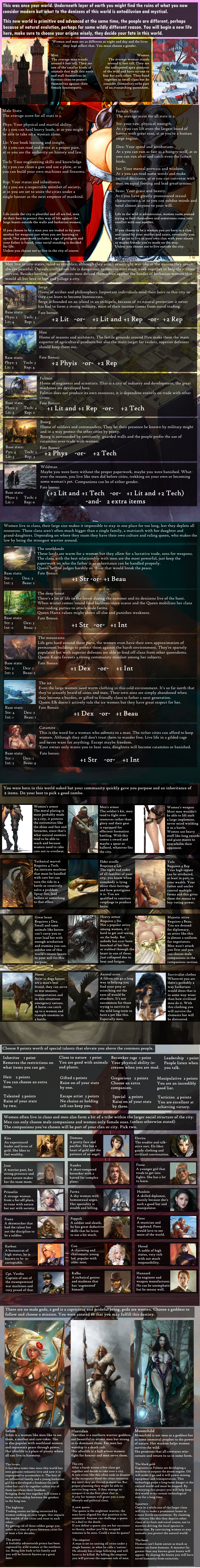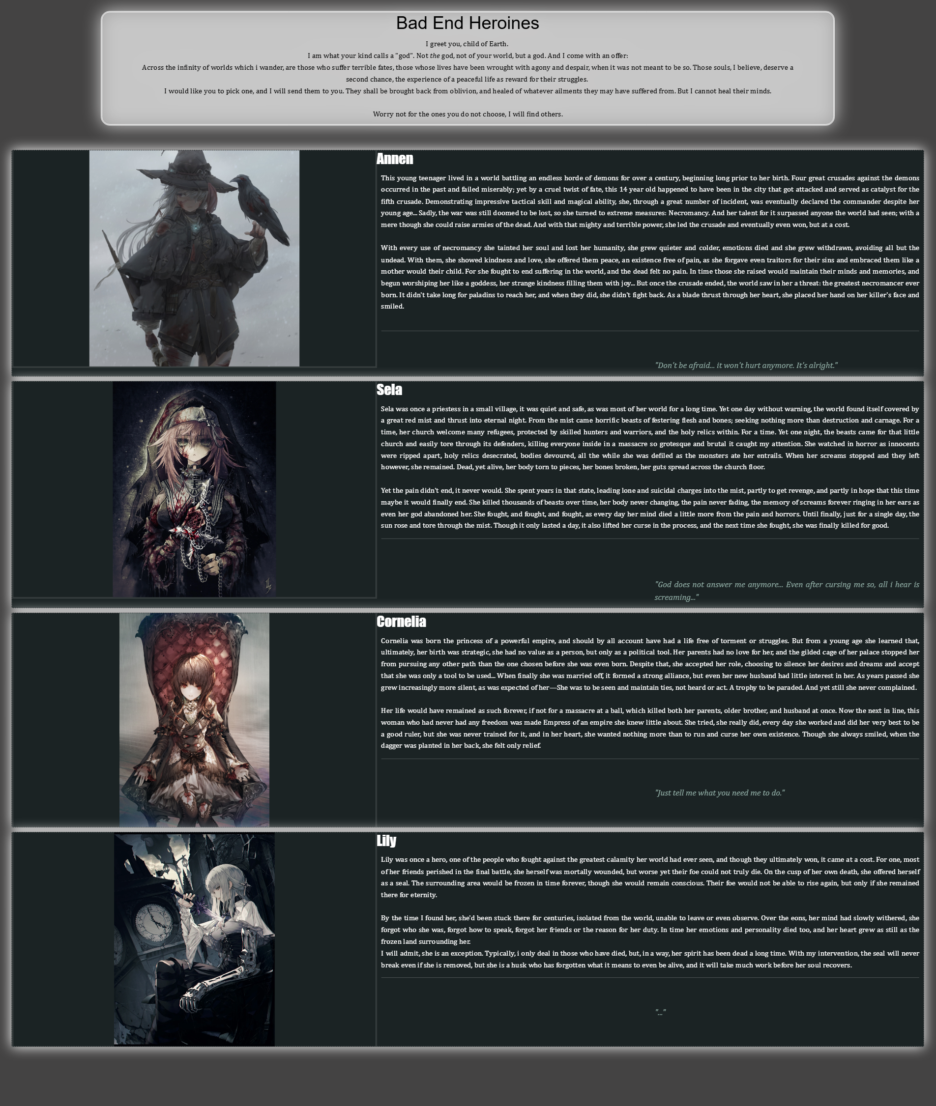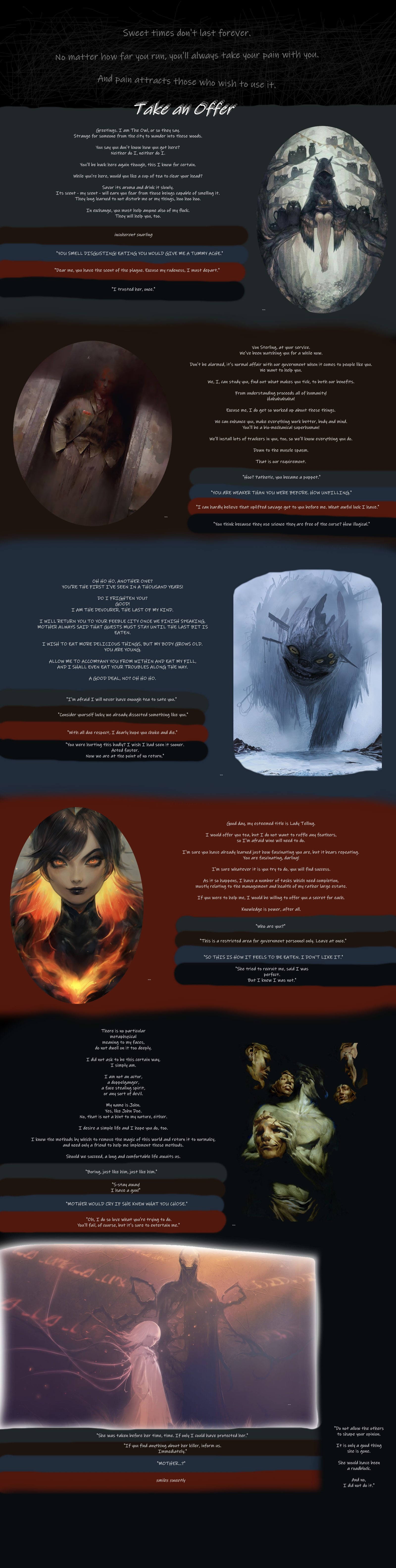 >>97520148Why are the most uniquely creative authors such lazy fucking assholes? They never finish a thing. This is one of the most aesthetic cyoa concepts I’ve come across and yet it’s probably just sitting there rotting away. When was the last time black magic received an update? Like five years ago? It’s the same with Liminal phrenic; they’re always dumping highly interesting WIPs and never a real finished product. Their ideas rarely go anywhere. Like their Alice in Wonderland horror cyoa. It’s been a WIP for like forever.