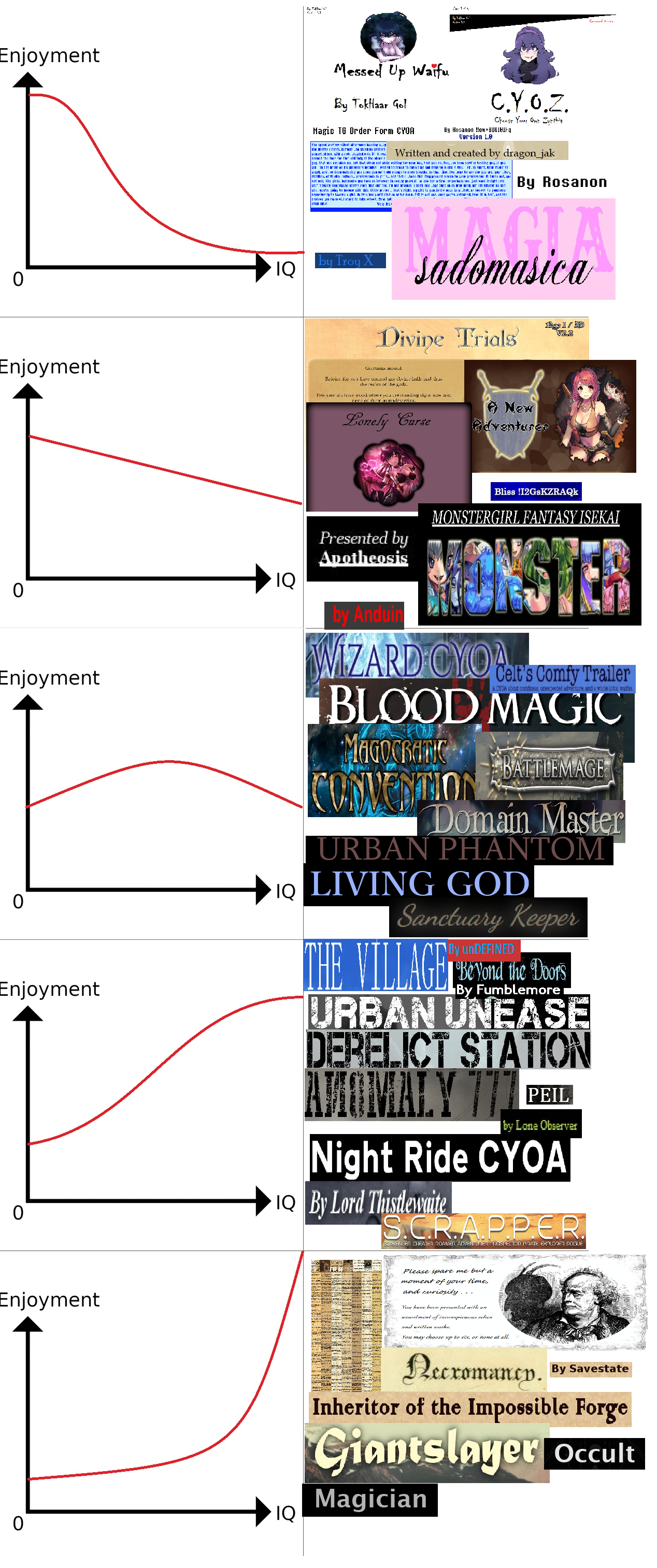 >>97520049I don't why Occult and Magician are lumped with BM. They are fairly short and simple cyoas and quite enjoyable unlike the unrewarding slog that is black magic.