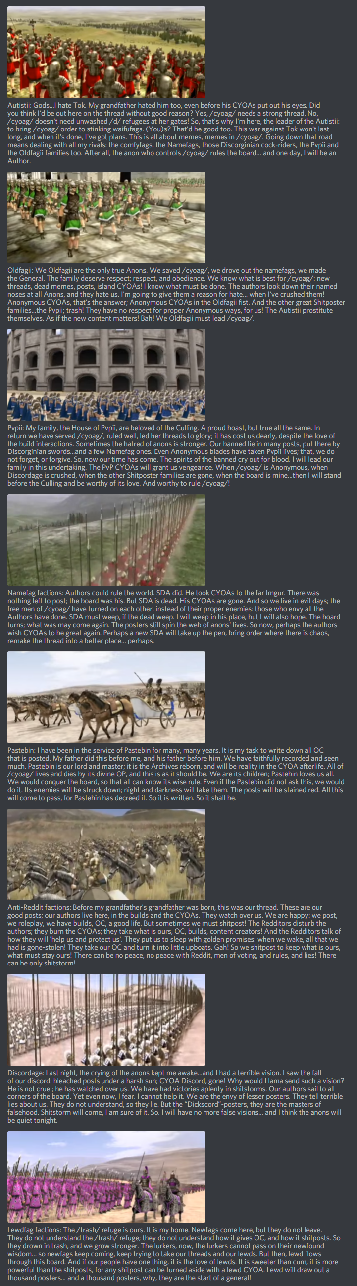 >>97517631>I'm pretty amazed at some of the facts and timelines you call up seemingly from nowhere. Do you write these things down, go back to confirm them, or just remember it all?A lot of it is memory (been here since 2018 or so), reinforced by trips to the thread archives (when I have time, I go looking for old cyoas and forgotten lore tidbits). That's why you'll rarely see me mention exact dates - it's a lot easier to remember why people started arguing than when :)