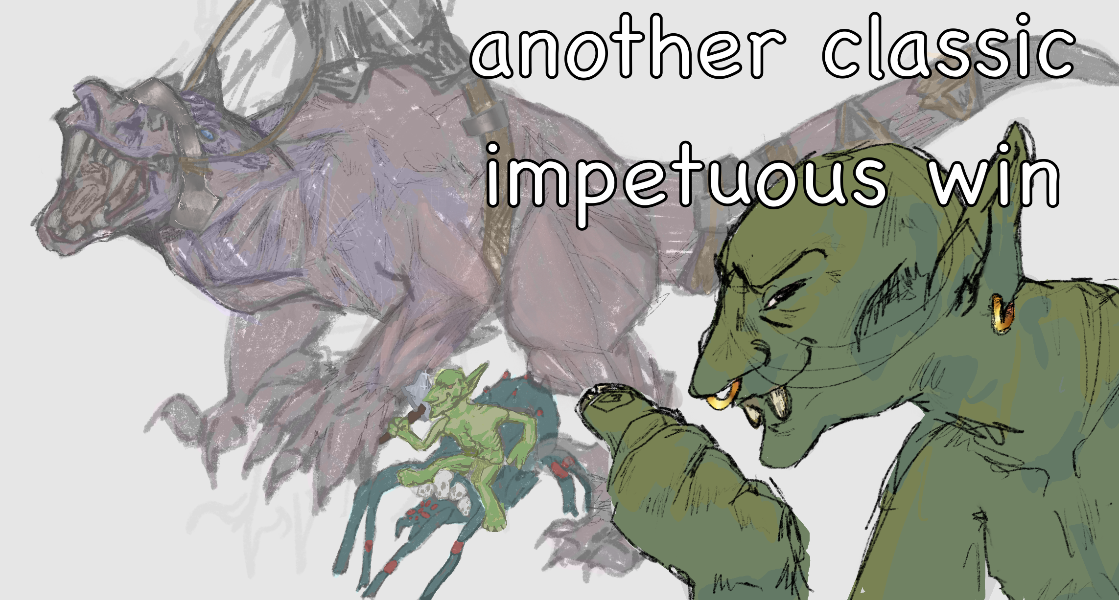 >>97523253lol, she made her own fan art for the battle. She coming back.Her goblin big boss failed the impetuous check, but passed the terror check to charge the carnosaur.