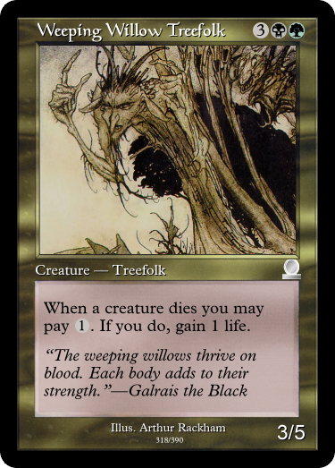 We end Golgari with 'The Witch of Flanders'. Originally this had a drawback of giving you a poison counter when activated, but it was so unnecessary I dropped it.