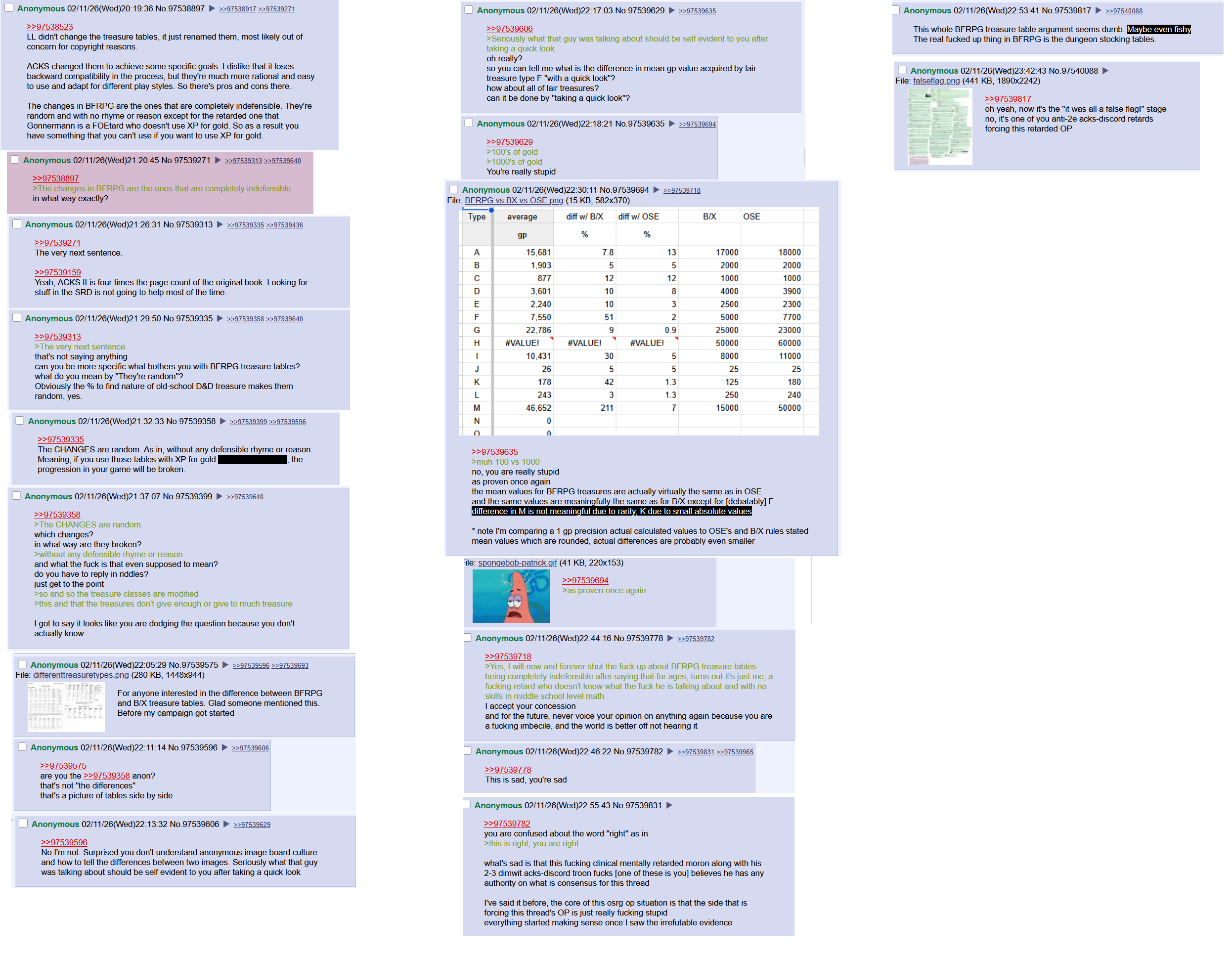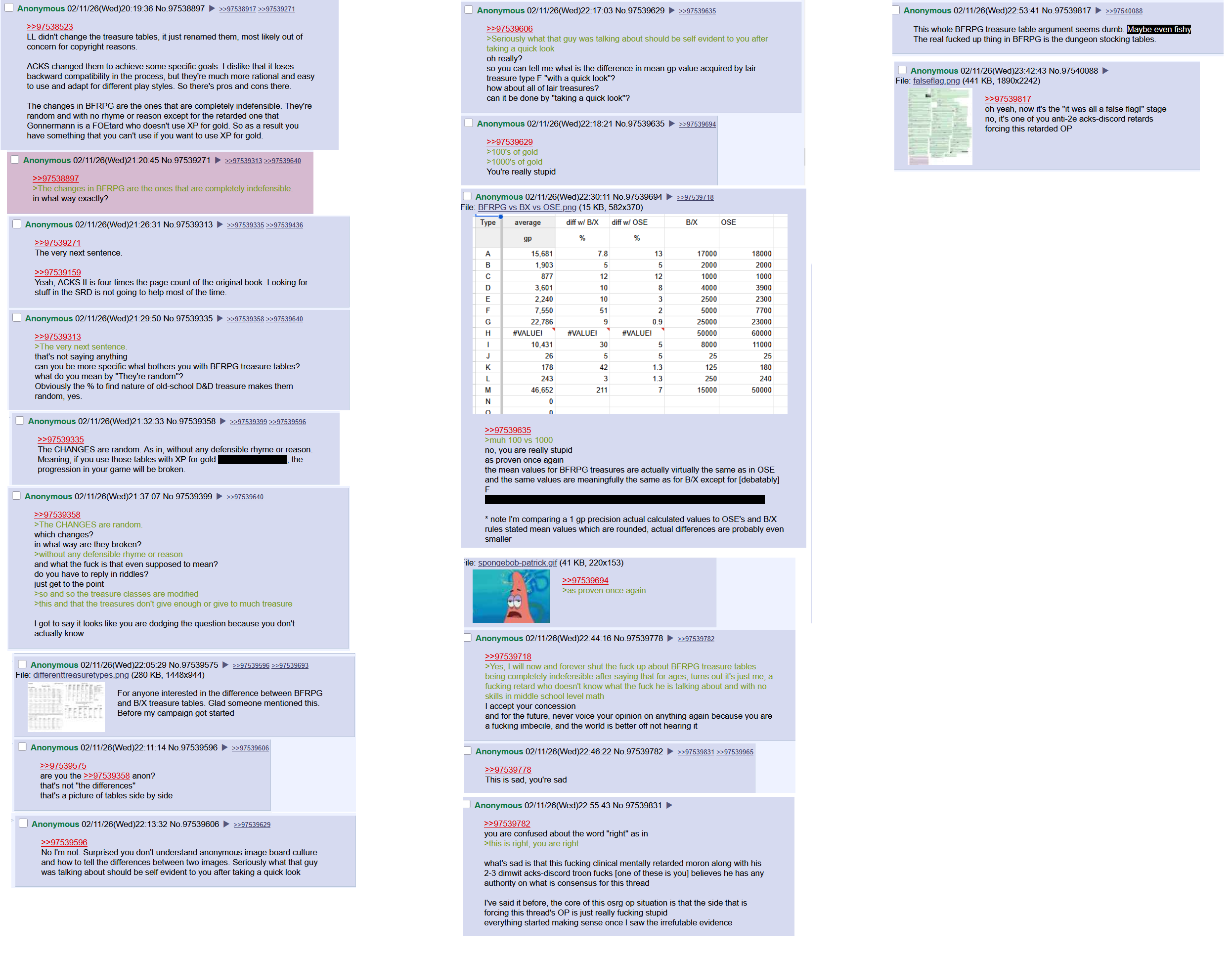 >>97538523LL didn't change the treasure tables, it just renamed them, most likely out of concern for copyright reasons.ACKS changed them to achieve some specific goals. I dislike that it loses backward compatibility in the process, but they're much more rational and easy to use and adapt for different play styles. So there's pros and cons there.The changes in BFRPG are the ones that are completely indefensible. They're random and with no rhyme or reason except for the retarded one that Gonnermann is a FOEtard who doesn't use XP for gold. So as a result you have something that you can't use if you want to use XP for gold.