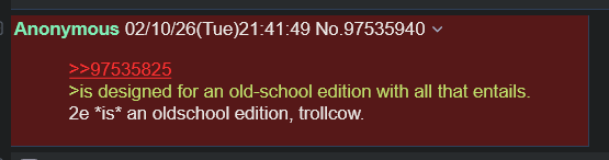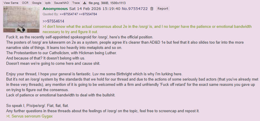 >>97568268I’ve been repeatedly told that 2e belongs here and that the /2eg/ is a troll thread.