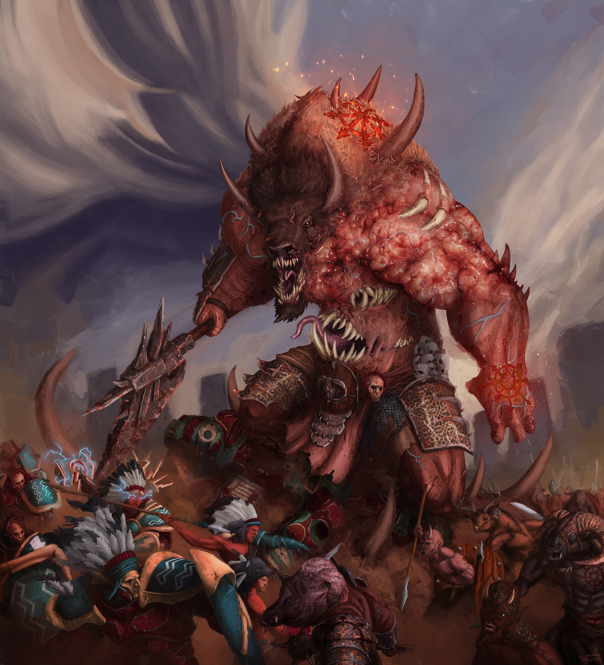 Warcry as a Xcomlike where you play as a Chaos warband exploring the eightpoints and currying favor with the chaos gods in a bid to get Archaon's blessing and fight by his side in his assault on Sigmar's realm. It starts off with fighting other lesser warbands as well as Order warbands who seek treasures then ramps up to more organized and well equipped chaos cults and warriors of Sigmar sent to hunt your warband down. The Dark Gods' Favor mechanic not only affects your teams' buffs but also alters how they look and what exclusive gear they can get. For instance if you go all in on a certain god you get locked out of the other gods but your dudes start looking like Khornate cultists with the unique upgrades exclusive to him, or you can double or even triple dip to become unique warbands, like a Slaanesh-Tzeentch band would become something like the Cypher Lords, or a Khorne-Nurgle warband looks something like Iron Golems, hardy warriors who feel nothing even as they tear people's heads off.