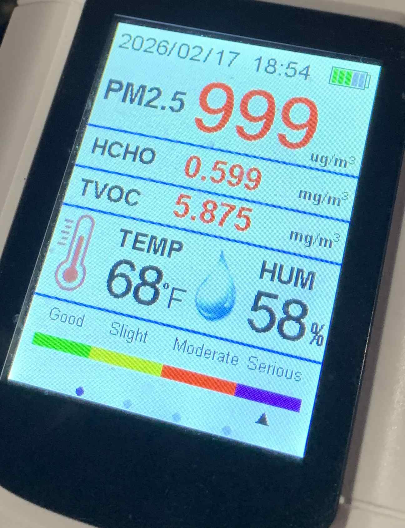>>97569511earlier in the other roomafter an hour of sitting in a different room (printer and purifier were running in the other room)>PM2.5: 10 ug/m^3>HCHO: 0.011 mg/m^3>TVOC: 0.050 mg/m^3>53% humidity>66 Fafter an hour of sitting directly on top of the printer with the purifier in the room>PM2.5: 4 ug/m^3>HCHO: 0.050 mg/m^3>TVOC: 0.231 mg/m^3>23% humidity>88 Fnext tests:>move the monitor to my desk and take another reading>turn the filter off for a bit, then take all three readings again>tomorrow, fry some food and see what the air quality monitor reads during the process
