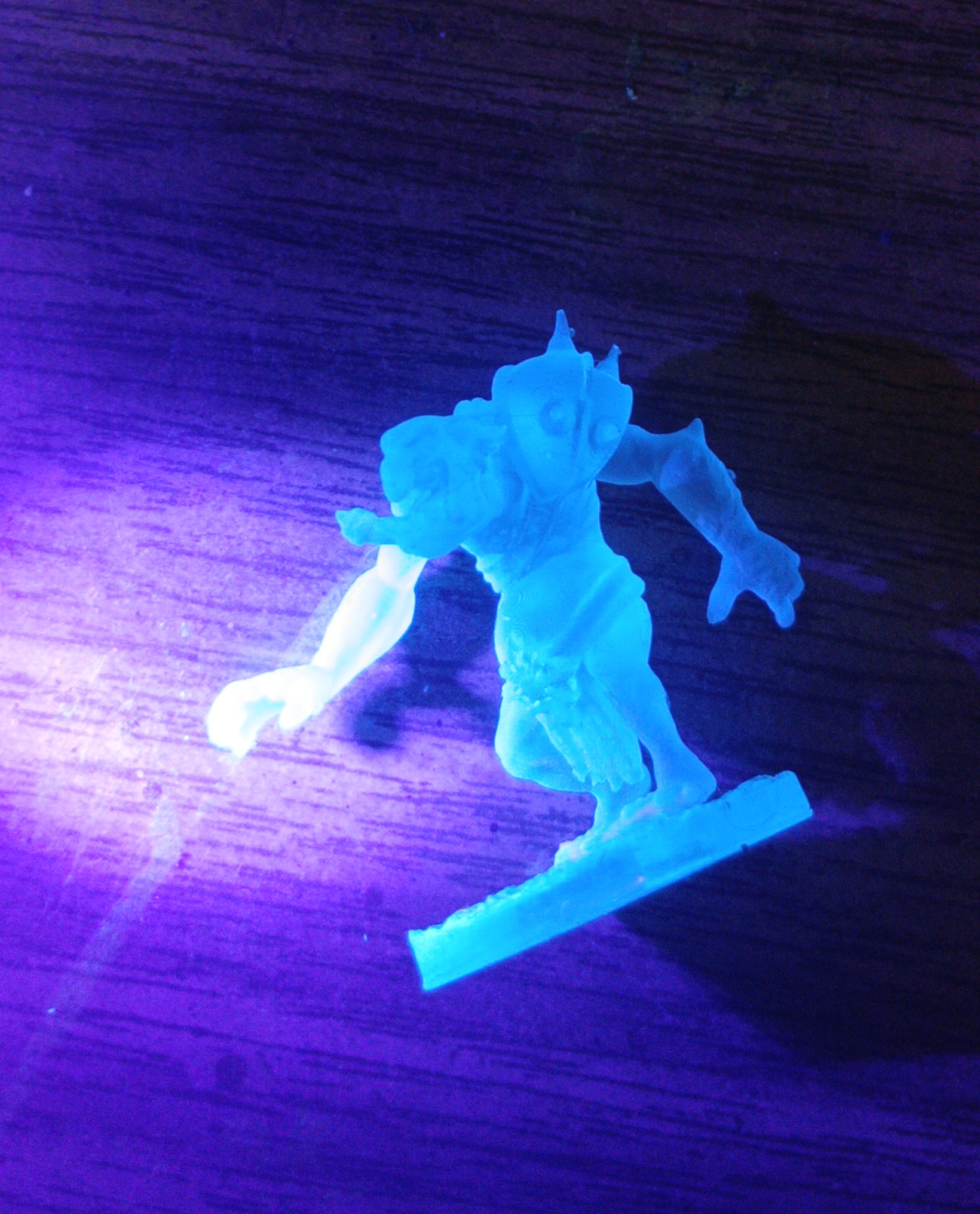 >>97623637>keyboard physicistNo, I understand beer-lambert, you don't even know wtf that is until you google it.clear (unpigmented) surfaces do not block UV, clear resin being UV sensitive ABSORBS it, but only until the reactive photopolymers are all saturated (cured) once that is done that layer no longer blocks.Translucent red/black surfaces do meaningfully block UV, opaque surfaces of any colour fully block UV. your grey resin is uncured, my clear resin is fully cured.Additionally the observable fact that clear resin fully flouresces under UV (glows blue in terms you can fathom) shows that UV is fully penetrating as the flourescence is a byproduct of UV absorption specifically (does not involve the visible purple wavelength of the light source).For clear resin to stop UV it would need to be thick enough that flourescence to not occur on the far side, well over a foot thick.