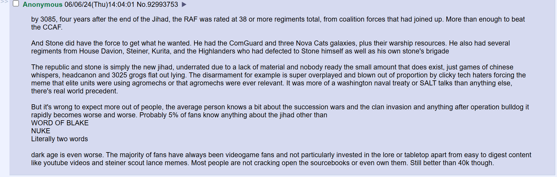 >>97544027At least he cared about battletech enough to rant about it.Current writers CGL is forcing to write battletech would rather write shadowrun or political tweets instead.