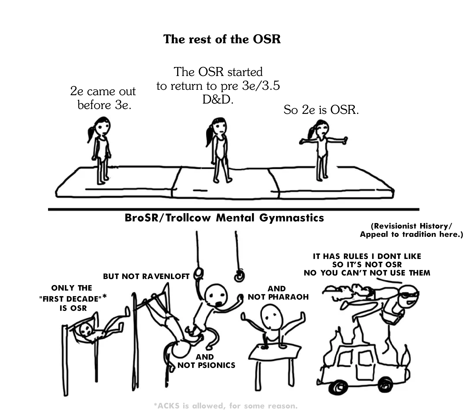 >>97535927see >>97535913Trollcow tries to push the narrative that 2e is "not osr" because it's not part of the games "first decade" and that ONLY D&D content from 1974-1983 is "Oldschool" (which is a highly inaccurate definition, mainly because there's so much more oldschool content after it, and the "First decade" has MANY pieces of material that fall outside of the common OSR style into the "Trad" camp, see Ravenloft & pharaoh)