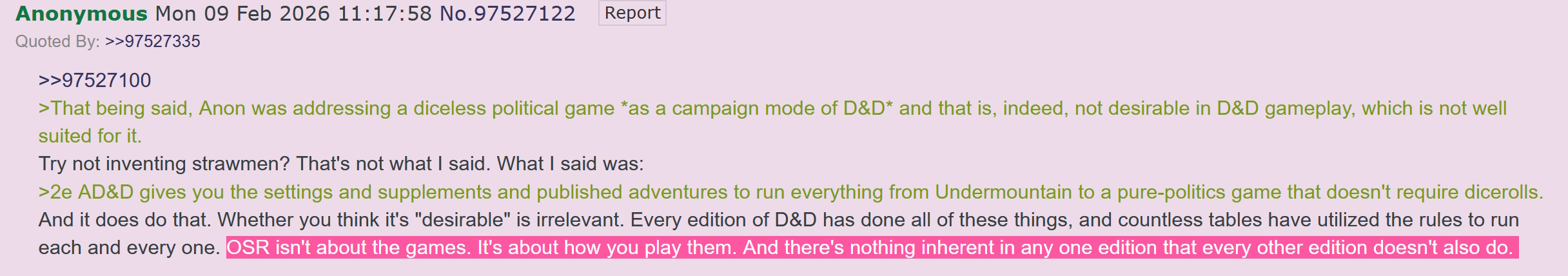 >>97536105>a quote from youNever said it, and whichever anon did is wrong. shocking that everyone who disagrees with you is more than one person, trollcow.OSR is about editions of D&D before third edition.