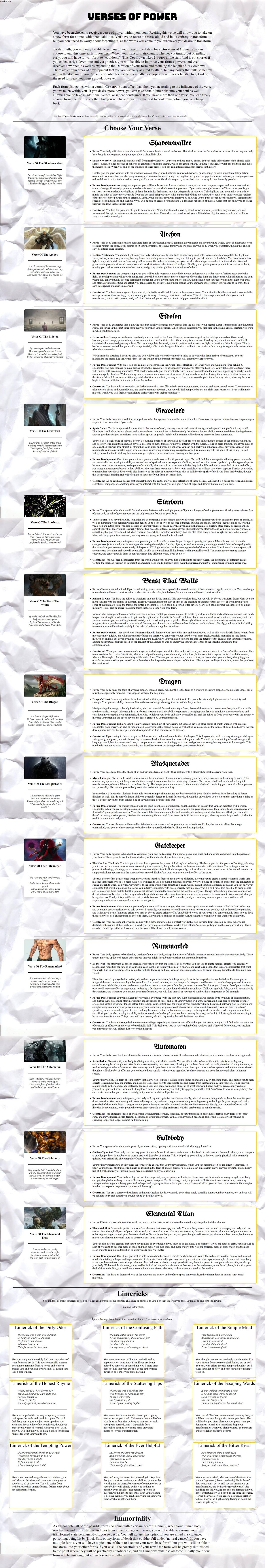 >>97538686> VersesElemental Titan (Base)Gatekeeper (No Constraint)Gatekeeper is easily the strongest thanks to multiversal travel, Elemental Titan has a constraint I'm willing to put up with until I die of old age and ditch it.> LimericksLimerick of the Honest RhymeLimerick of the Bitter RivalBitter Rival doesn't get immediate multiverse access like I do so I can easily outscale them. Honest Rhyme is annoying but it'll go away eventually.