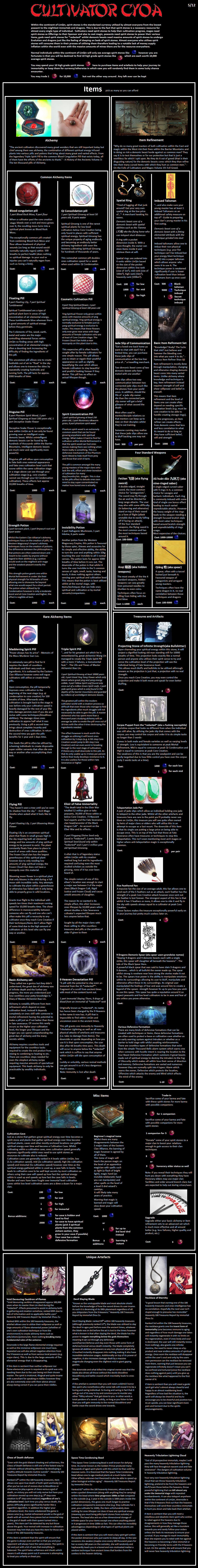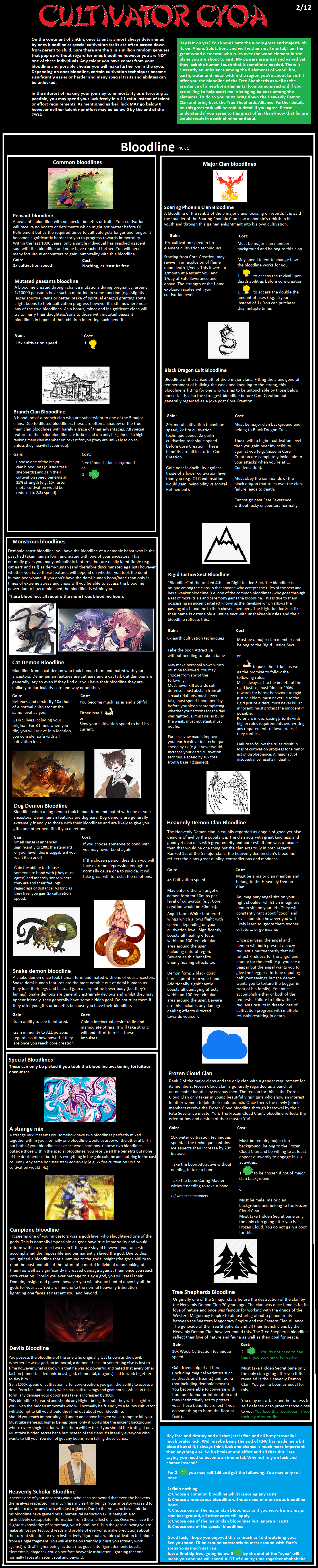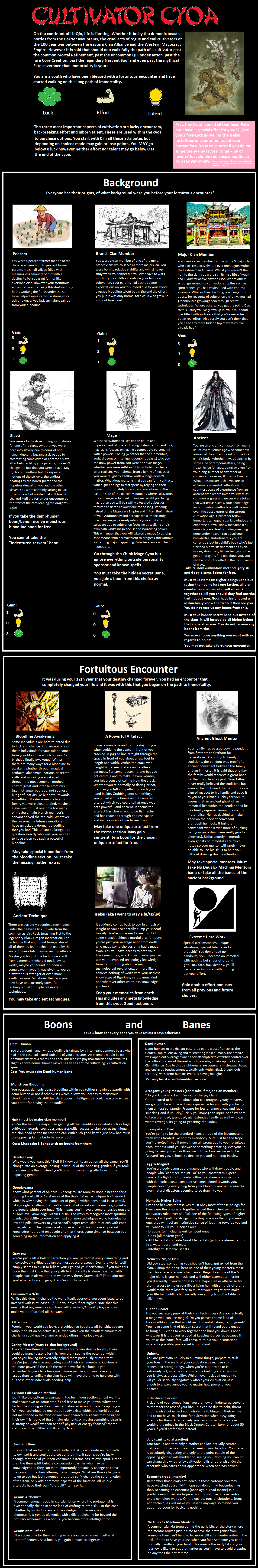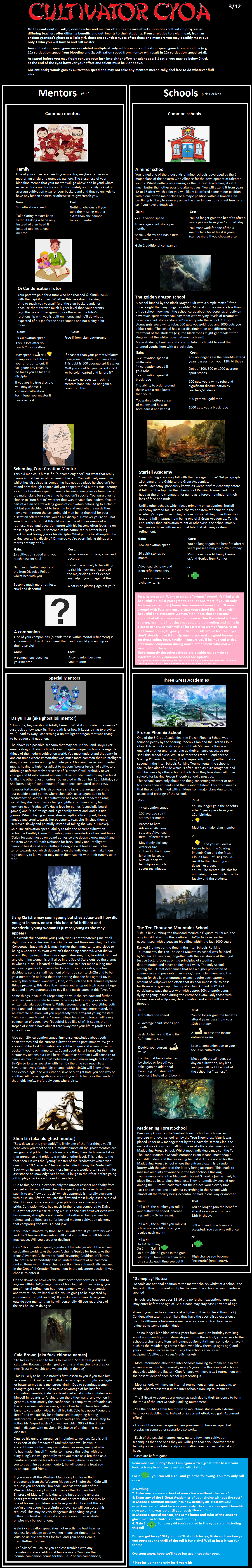 >>97538952>BackgroundMajor Clan>Fortuitous EncounterIsekai>BoonsDemi-Human, Gary stu, Attractive, Caring Master, Custom Cultivation Method(self made), Genius Alchemist>BanesDemi-Human, Incompetent Trash, Nemesis: Major Clan(probably Black Dragon Cult, I'm a demi-human at their school), Hidden Secret, No Dues Ex Machina Mentors>BloodlineFrozen Cloud Clan (male)>MentorScheming Core Creation Mentor>SchoolThe golden dragon school (black robe)>TechniqueFlowing Redirection if I got one here on top of the custom one.The custom one would be a water and ice one, focus on cleansing/purifying, improving/tempering and protecting the self, maybe make it near impossible to train, becoming moderate or easier when a lot of yin qi is available, at least a cultivation speed boost of 3 and Core creation limit.>ItemsQi Consolidation pill*8, Spirit Concentration pill, mid rank Spatial Ring, Jade Slip of Communication, Immortal Cultivation Cave (hidden, plants(at least ying spiritual flower so the cave got lots of yin qi), alarm and defensive formation (one high grade stone each)), 2700 average spirit stones & 2 high grade stonesI don't know if getting a Basic Alchemy set now is worth it, I want to use the high stones to cultivate and the average as fund to start getting more money/stones.Hoping the cultivation speed boosts with the starting pills are enough to, in two months, reach a stage when most cultivators(the weak one) aren't a danger to me.I should have a cultivation speed boost in the thousands, if it's practical to stack every bonus in universe (maybe can't stack the school and cave or pills, I don't know how the school gives you *5).I hope the unused points from the background do something, like being more talented in my case.