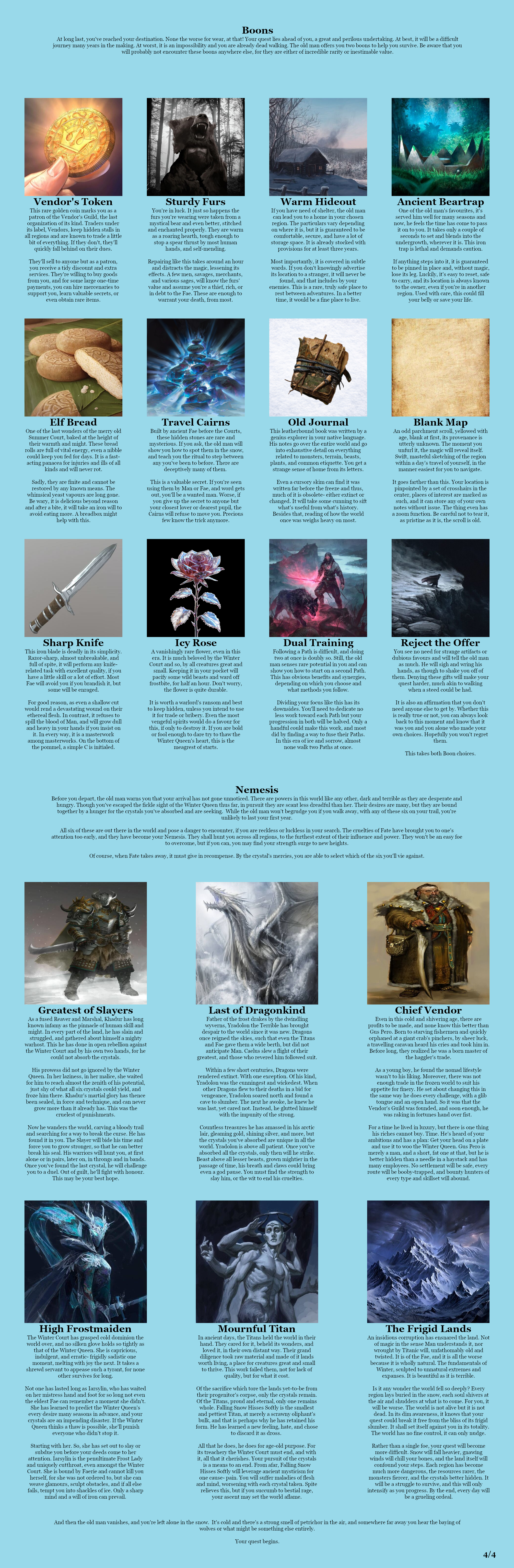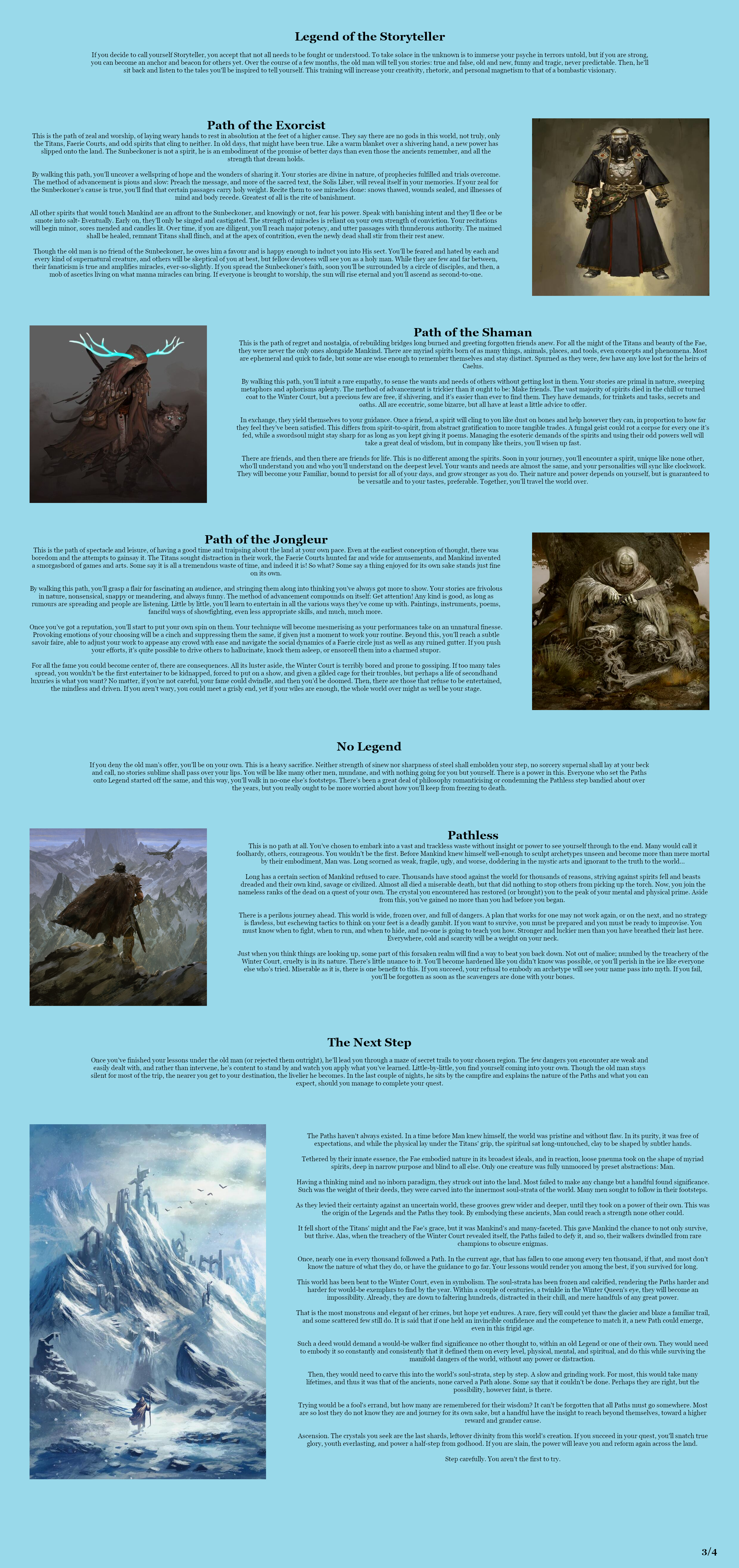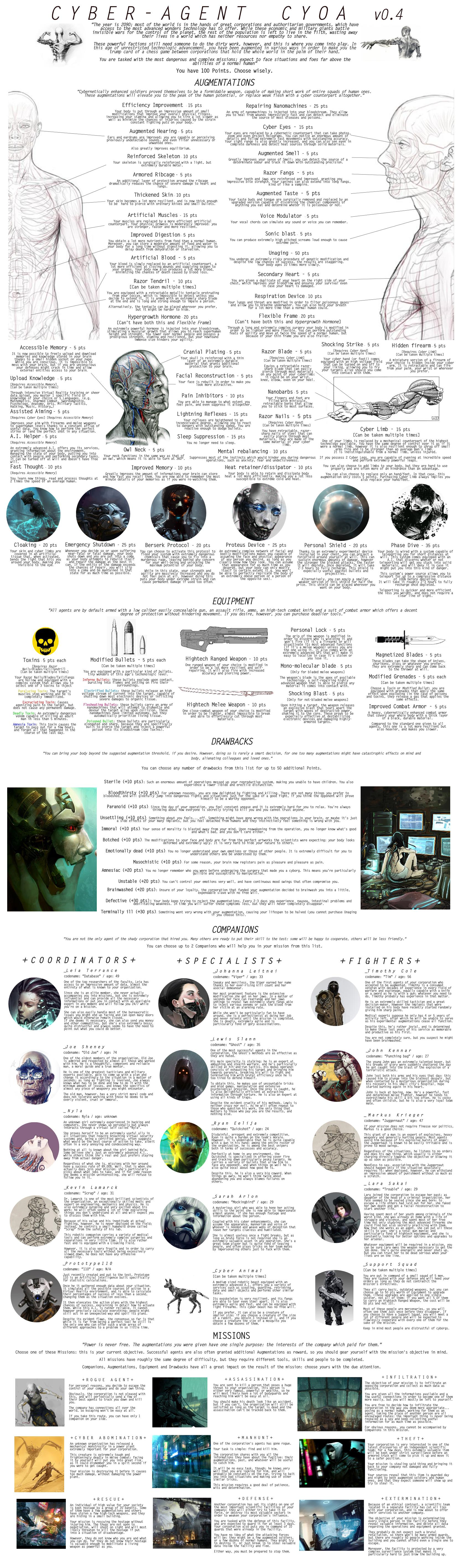 >>97539763Thank you, these are the exact kind of suggestions I was hoping for.>>97539768Yes, I pixelated it to avoid spoilers but uploaded the illegible version so anons know it is being worked on. I'm uncomfortable with the idea of WIP posting but don't want to leave anons in the dark. This is my attempt at reconciling both otherwise mutually incompatible goals.>>97539788A god amongst men.>>97539815I assure you it is real. It will require a couple more months but it will exist. I'll be using your choice of starting location to expound on lore, but might need another page of lore. I doubt it though, the factions should be enough.>>97544960Thank you, that is a good insight. I'm slightly unsure of quests that aren't baked into the premise since they put expectations on anons, but an events section is brilliant- it allows anon to make his own quests while keeping up the sense of urgency. I think the CYOA will have the cheat section for determining initial power, the augments section for customizing it, a location section for lore, and an NPC section where you choose your allies, rivals, and nemesii. Allies can be ignored entirely to gain more augments but this will make life harder. I liked how Spirit Conscript did its NPCs so each character will have a bit on their personality, powers, and fighting style and then a little blurb on what their goals will be depending on their relation to the player, including neutral default ambitions. After this, there will be a threat section, describing what else you're up against, which you can worsen for more allies/augments, and an events section, for additional lore and things to do. So far I'm unsure if I need to have a separate faction section going over each one's specific forces and lore, or if it would be better to keep them more as part of the background. Breaking the stalemate in their centuries-spanning war will be your default goal, but betraying the world will also be possible.