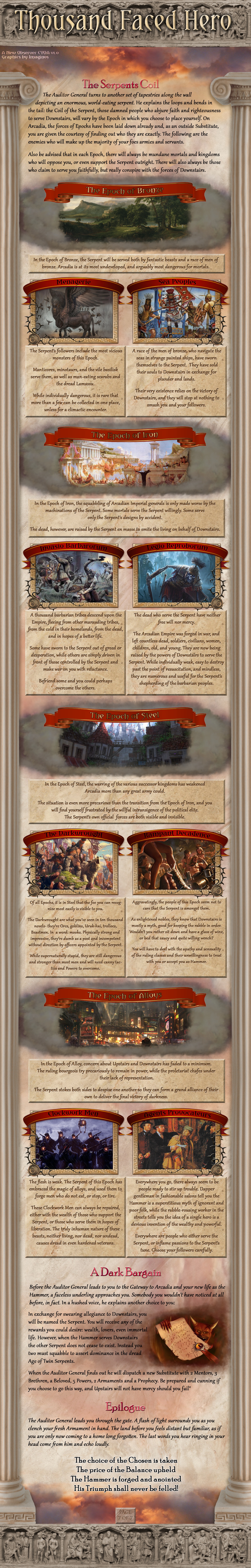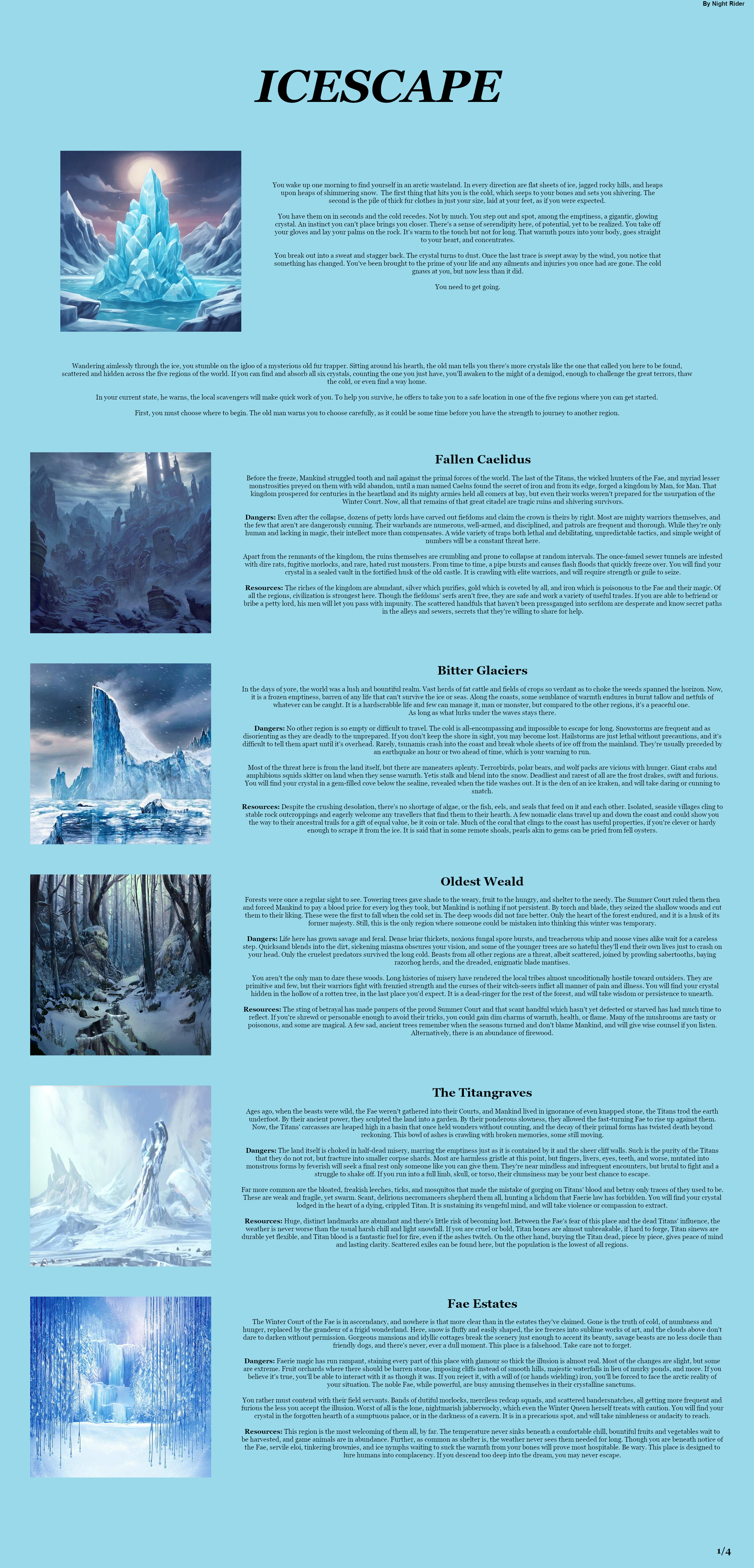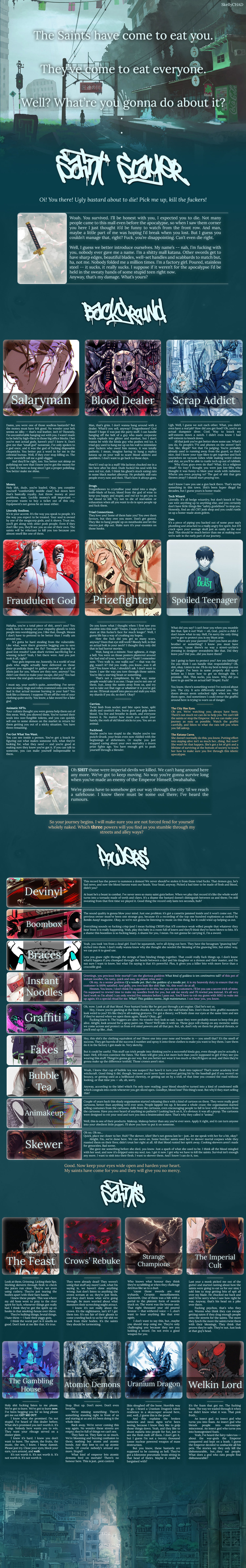 >>97539763Thank you, these are the exact kind of suggestions I was hoping for.>>97539768Yes, I pixelated it to avoid spoilers but uploaded the illegible version so anons know it is being worked on. I'm uncomfortable with the idea of WIP posting but don't want to leave anons in the dark. This is my attempt at reconciling both otherwise mutually incompatible goals.>>97539788A god amongst men.>>97539815I assure you it is real. It will require a couple more months but it will exist. I'll be using your choice of starting location to expound on lore, but might need another page of lore. I doubt it though, the factions should be enough.>>97544960Thank you, that is a good insight. I'm slightly unsure of quests that aren't baked into the premise since they put expectations on anons, but an events section is brilliant- it allows anon to make his own quests while keeping up the sense of urgency. I think the CYOA will have the cheat section for determining initial power, the augments section for customizing it, a location section for lore, and an NPC section where you choose your allies, rivals, and nemesii. Allies can be ignored entirely to gain more augments but this will make life harder. I liked how Spirit Conscript did its NPCs so each character will have a bit on their personality, powers, and fighting style and then a little blurb on what their goals will be depending on their relation to the player, including neutral default ambitions. After this, there will be a threat section, describing what else you're up against, which you can worsen for more allies/augments, and an events section, for additional lore and things to do. So far I'm unsure if I need to have a separate faction section going over each one's specific forces and lore, or if it would be better to keep them more as part of the background. Breaking the stalemate in their centuries-spanning war will be your default goal, but betraying the world will also be possible.