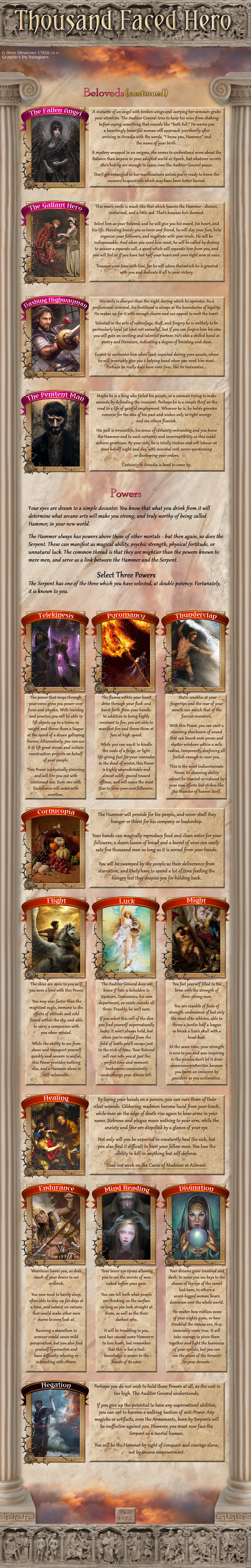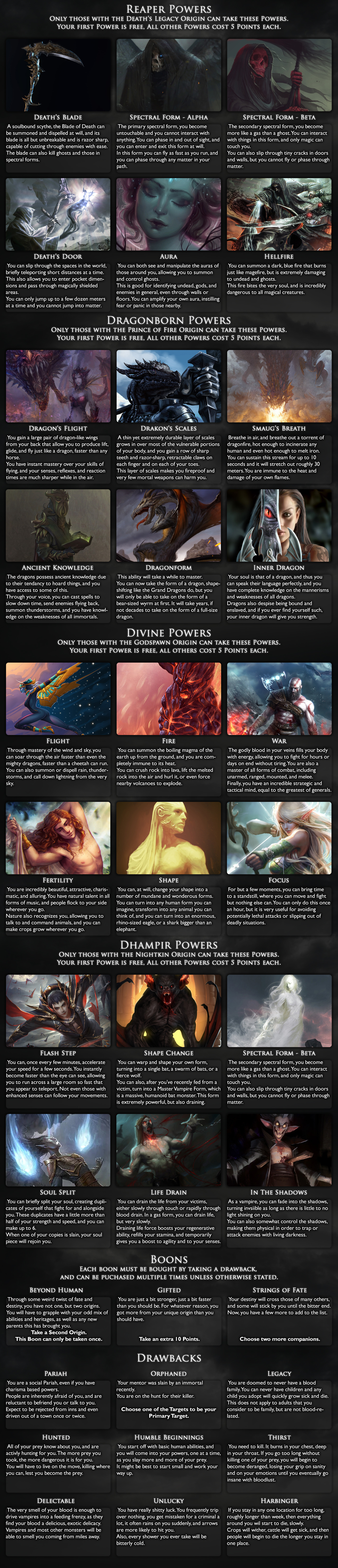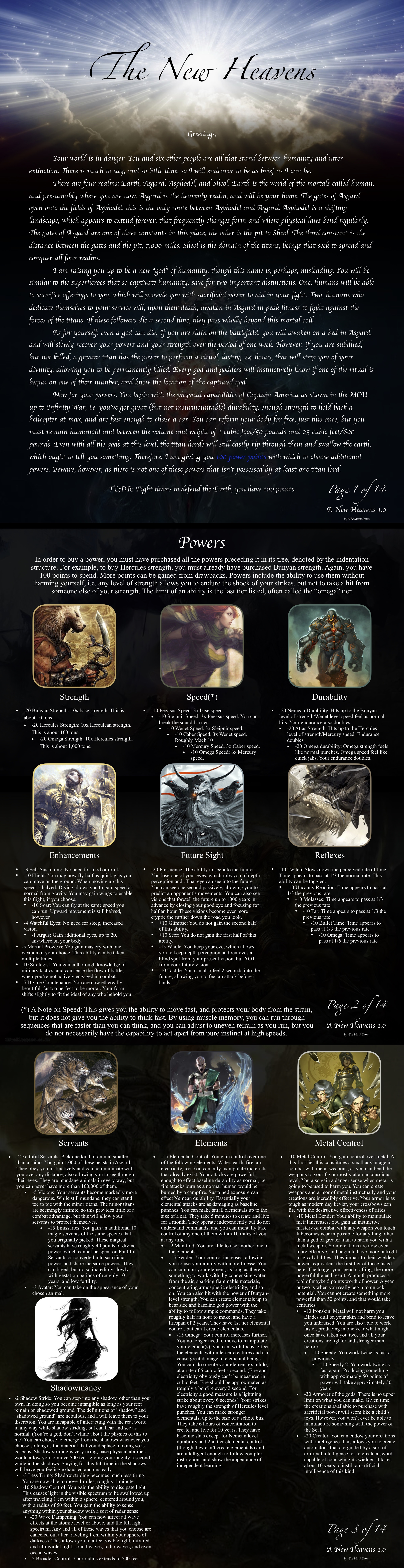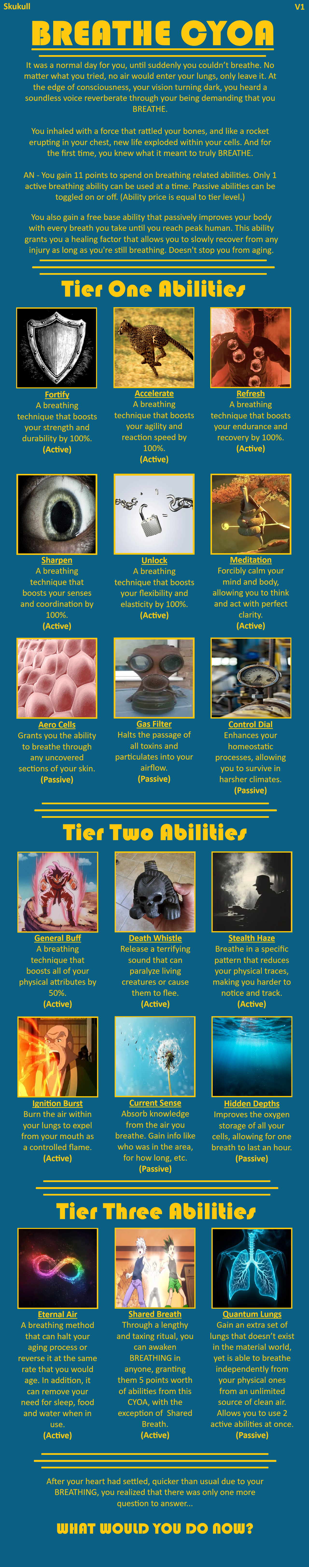 >>97538960Somewhat so, yes! I dislike when CYOAs are vague on the capabilities of the player, because everything seems similarly unfounded by contrast. All of the powers have several examples of what users can do at each skill level, which I hope anons will be able to extrapolate more information from for the context of their adventure.
