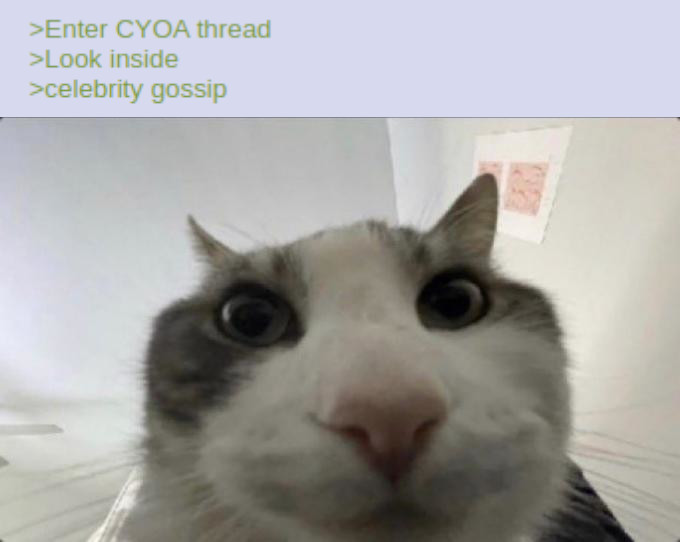>>97543768>Tell me about the female human CYOA author known as "Aromage".>Why are certain members of this "/cyoag/" community obsessed with her?Before my time, but the old guard used to say that when she came to 4chan, Aromage had a very leftwing/SJW/PC persona. Which meant that she quickly became a favorite target of the trolls and shitposters.Later, she started to take grief for using a lot of pop culture/franchise characters in her cyoas.