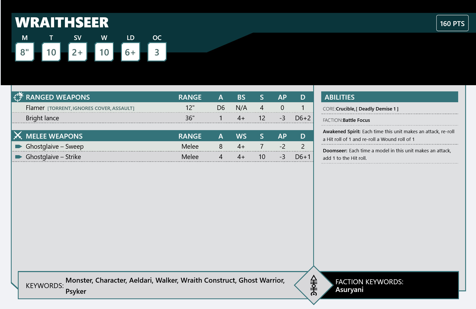 >>97547701I was gonna ask if there's much of a point in making a wraithseer but it's the only way to get one fighting at 3+ to hit in melee since the actual wraithseer doesn't have psychic guidance.Also isn't that a mistake on your sheet, the bright lance hits on a 2+, no?You can make a wraithlord with 4 flamers which is pretty funny.