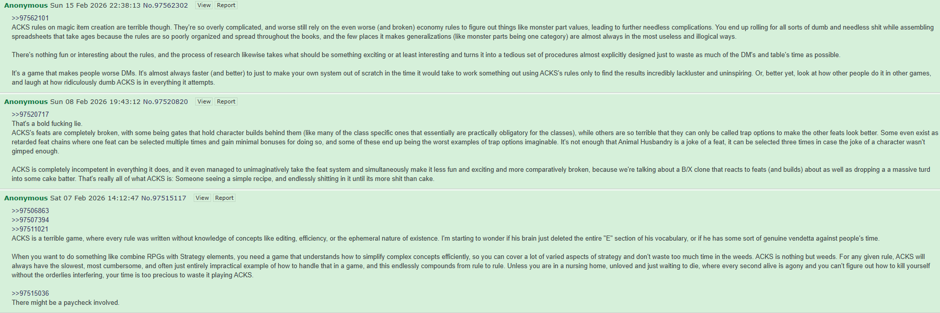 But I’m still willing to keep trying to make a genuine /2eg/, because I want a thread that expressly *does not care* about whether or not 2e counts as OSR. Because I don’t care. But there are enough people on the /osrg/ who care, whether “enough” is “a majority” or “one really loud and persistent troll”. And I’m tired of dealing with them.