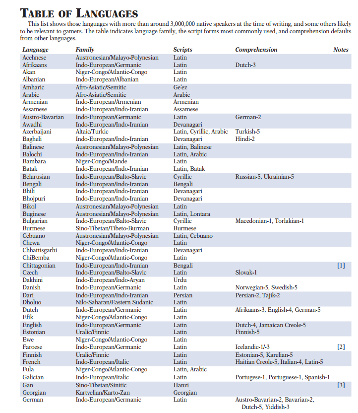 >>97554820I made a language tree for a campaign with >same language, word for word understanding >closely related language, general understanding>distantly related language, rough understanding, likely errors >no relation, no understanding that was fun for a fantasy renaissance european wars of religion vibe. The party could usually figure out close enough but sometimes there were gaps. It was clunkier than I wanted it to be at first and I sometimes forgot about it but I think it worked decently. Other games I don't bother. Depends on the vibes.