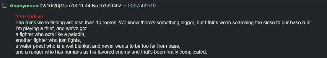 >>97569379The ruins we're finding are less than 10 rooms. We know there's something bigger, but I think we're searching too close to our base ruin.I'm playing a thief, and we've gota fighter who acts like a paladin,another fighter who just fights,a water priest who is a wet blanket and never wants to be too far from base,and a ranger who has humans as his favored enemy and that's been really complicated.