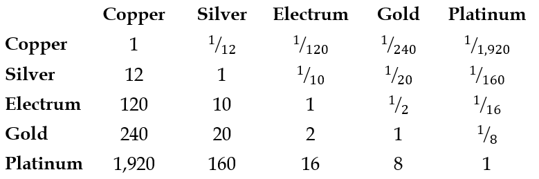 >>97583236By the way the platinum is 8 gp instead of 10 gp on the idea that it was *supposed* to be 10 gp, but corruption and debasement cut down on the actual platinum content of the coin, and assays over the years have determined that the typical platinum coin is more likely to be physically worth 8 gold than 10.Also thieves actually hate them because they're impossible to spend despite their value. Most commoners can't make change for a platinum coin, and most merchants, on seeing some rando off the street trying to use a platinum coin, will say "you stole that" and refuse to do business with the person, assuming they don't just outright call the guard.