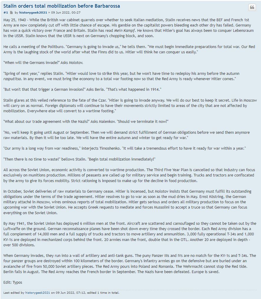 >>97602989I agree xister, history books need to be updated to show the truth that at the beginning of Barbarossa, the red army had just finished melting down the last of their guns to make farming equipment after their diplomatic absorption of Poland. The world could be so much better had they been prepared. I made a write-up on this.