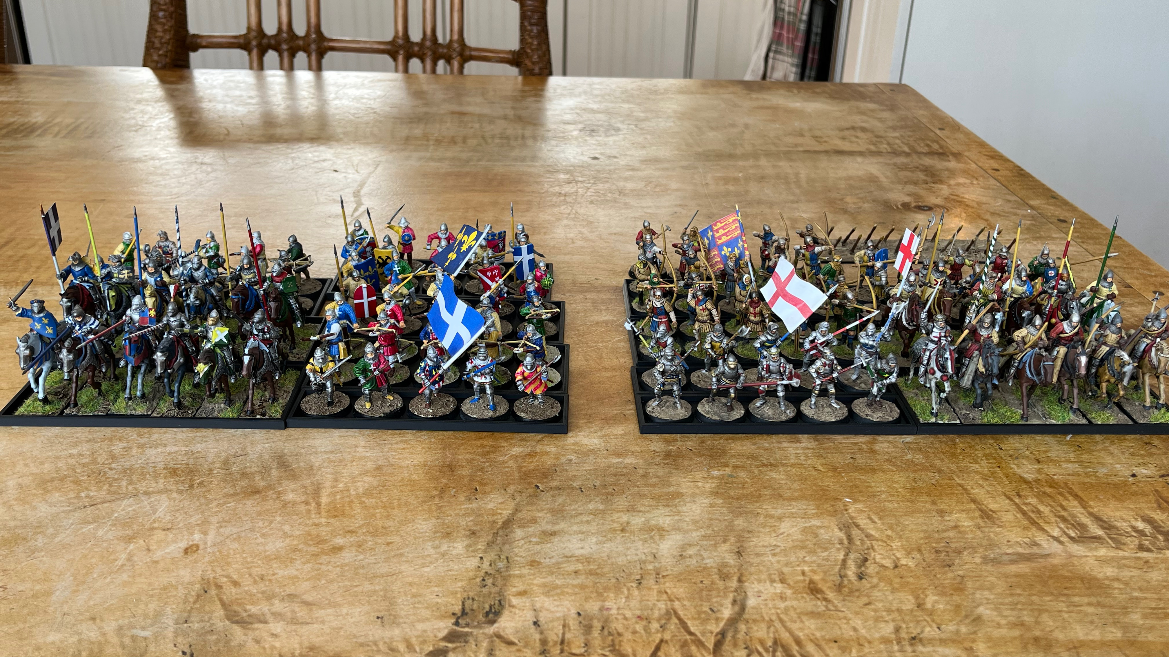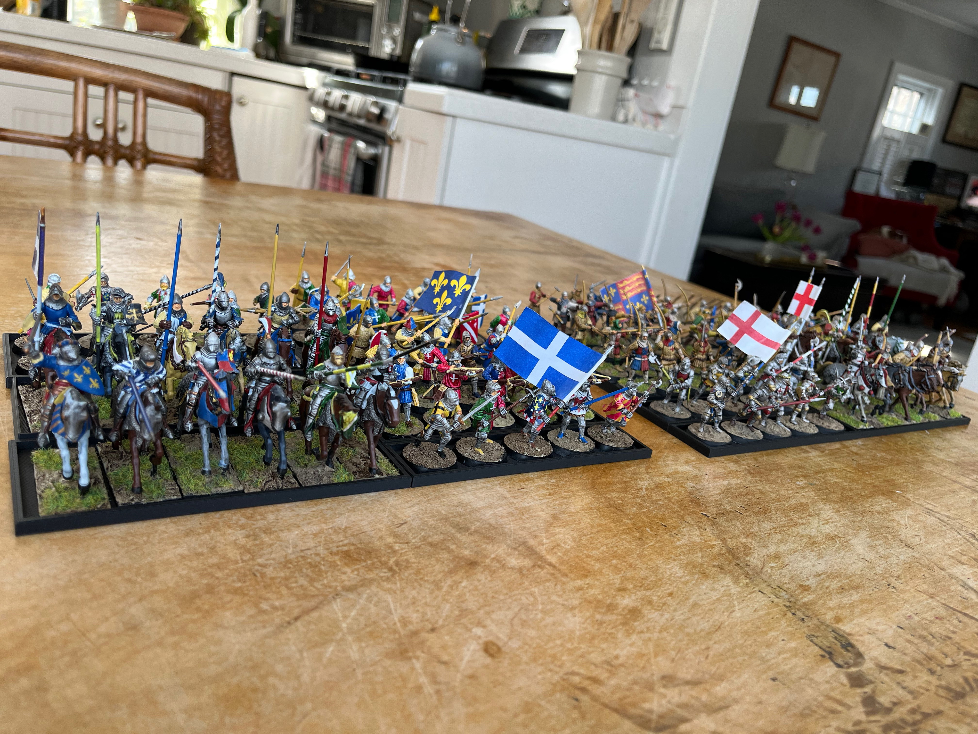 >>97576097YES HAHAHA YES!I have finally finished my english and french forces after like a year and a half! (Minus some touch ups like shading and adding grass to a few models). Feel relieved that its now done, really happy how it all turned out together. Except for the kind of shitty lighting here that makes the colors a bit more mute. Anyways, I have already played 2 games of lion rampant with them and plan to play some other systems too. Oathmark being one of them since I have 5x2 and 5x1 movement trays. Really like all the various colors and how the banners really pop out. Especially am happy about the especially colorful french foot knights. Has been a really fun time here posting my progress, thanks guys! Glad I got a project (mostly) done. Dont really have many miniature painters where I live, so a lot of people have been really interested in them when I bring them to the local gamenight.>>97605304yah, 28mm.>>97605184oh well, c'est la vie, looks fine enough from a distance. maybe a wash and some trimming will help.