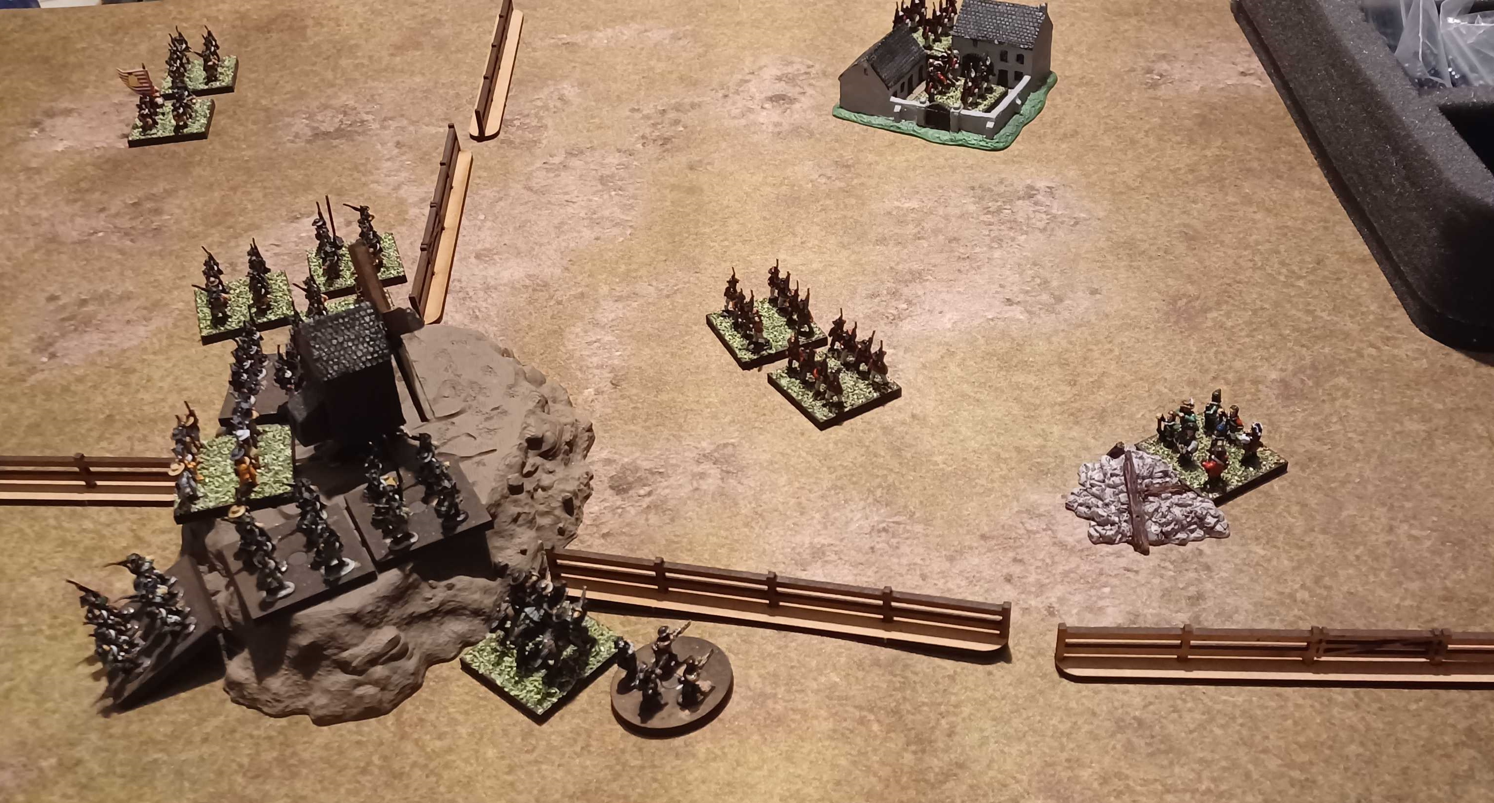 A little battle today, after many months. Using Rebels and Patriots. Photo is meh but whatever, taken at the end of the battleAmericans deploy with 3 Large timid line infantry, 1 line infantry, and 2 mounted skirmishersBrits deploy with 3 Good Shooter Light Infantry, and 1 free small militia unitObjective is to control the hillOne British light infantry enters the farmhouse, one in the south forms into close order, while the middle unit remains in open order but suffers from low ammunition, effecting the score needed to hit. The militia stay behind the main line for nowA unit of American mounted skirmishers quickly moves up to the northern fence, another attempts to flank the south, while the rest of the other units slowly move up. It does not take long for the British light infantry to open fire, causing a unit of skirmishers in the north to retreat, then eventually rout. The Americans push on and take the hill and fence line, coming under heavy fire. The casualties start to mount, but the sheer number of Americans is too much for the British, and the unit with low ammunition, which had scarcely caused any damage and lost half their troops, loses their nerve and runs. The militia unit is moved south and takes cover behind some rubble, but is ultimately ineffective. With the British unable to dislodge the Americans from the hill, and with night approaching, they retreat. The Americans have, despite the victory, suffered almost double the casualties of the Brits. >>97596252Not me>>97596228I will get the stuff out tomorrow and take a picI've been cracking on and painted another 3 battalions this weekNot worrying to much about painting the Americans at the moment, I've got most militia units done, just need to add flock to them and varnish