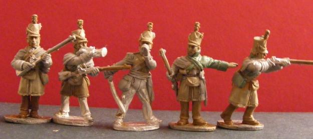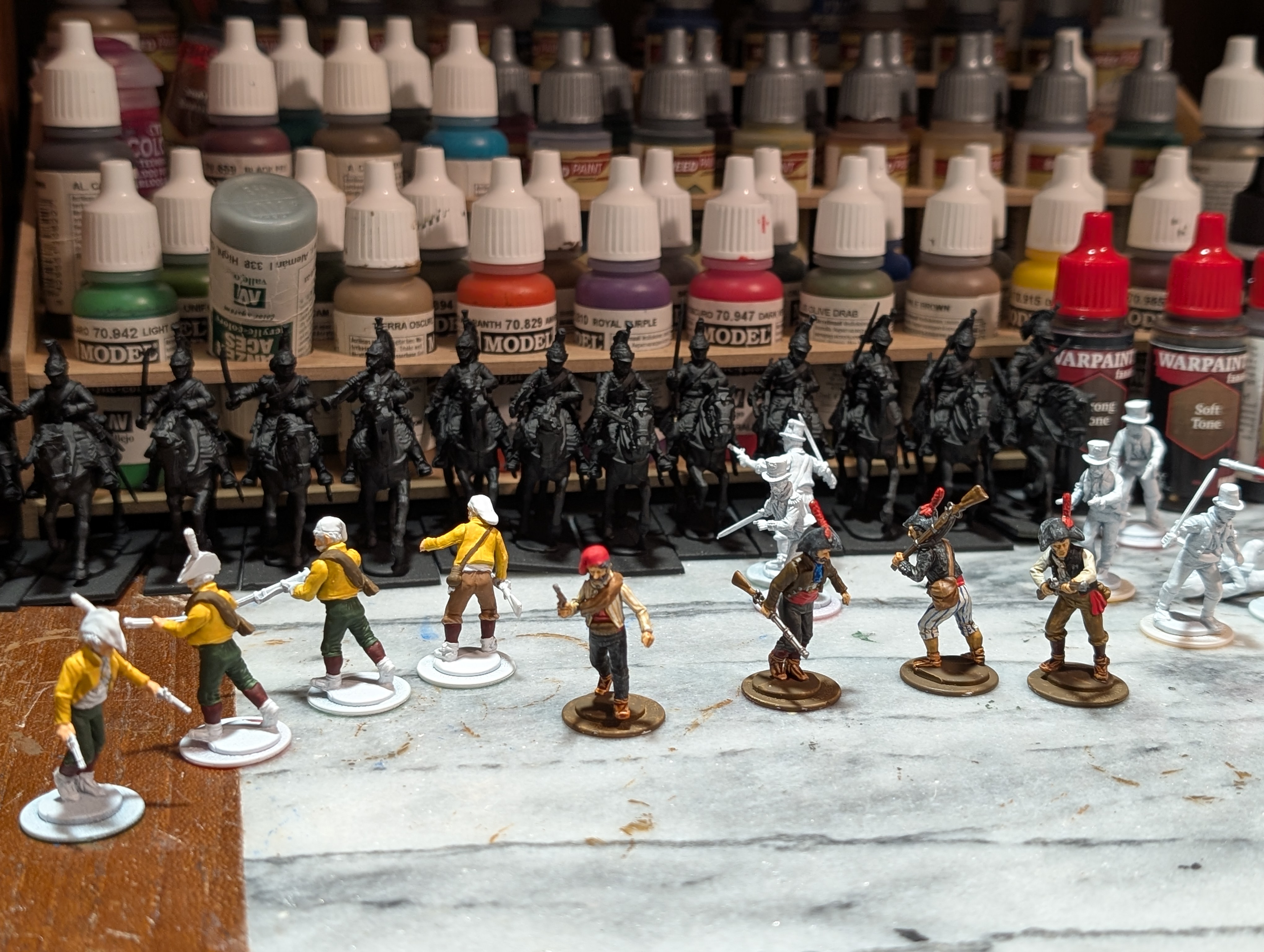 I've been working on Spanish Guerillas as well. I haven't decided if they're easier or harder to paint than uniformed troops, because on one hand they don't have to look any "official" way, but on the other have each one is unique to it's harder to batch paint. So I've been compromising by painting them in groups of 4 with the same general color palette to speed things up and waste less paint. The yellow jacketed Guerillas are wearing the uniform of Spanish light cav, suggesting their unit was destroyed and they fell in with the local guerilla troop, as Spanish regulars often did