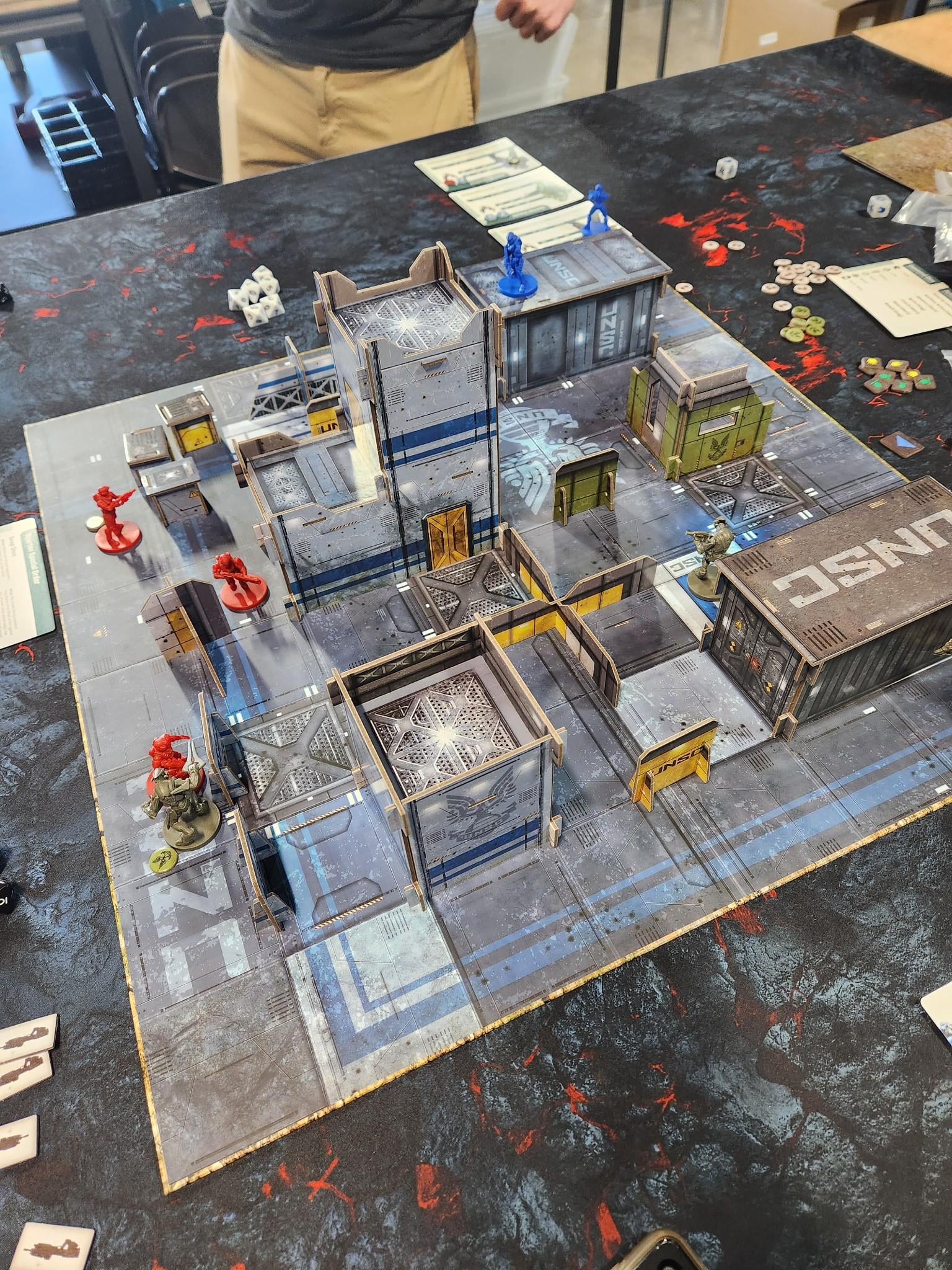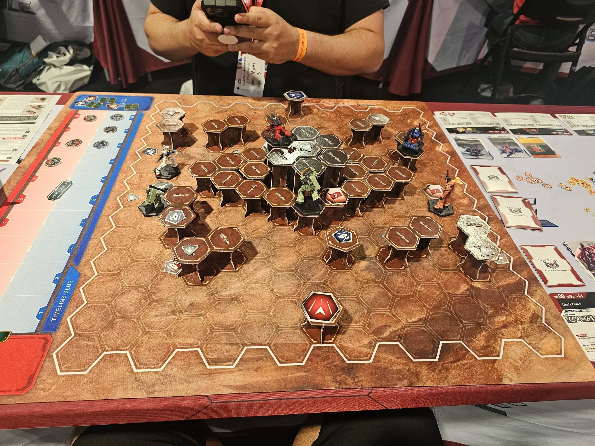 Didn't attend personally, seeing as I live about twice as far from Vegas as Frodo lived from Mount Doom, but I've gathered up some photos from online.No clue if they used real cards from the final game or just demo-only statlines, but nevertheless indicative of the general direction. Blue/red thing on the side of the board is the timeline track, this game's initiative system, which is basically just that stronger attacks delay your next activation by more; while weaker or non-attack actions lets that unit perform more total activations.