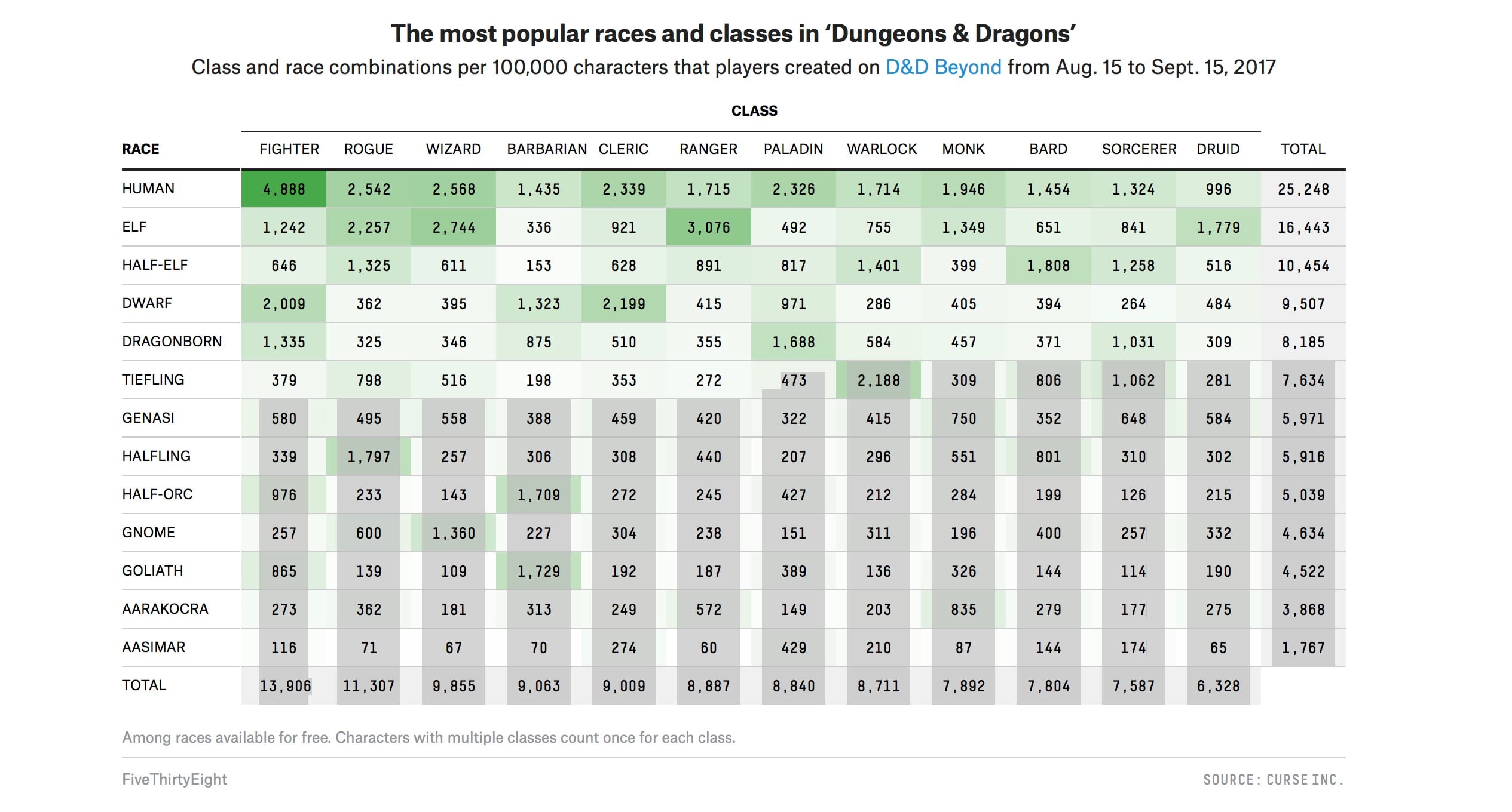 >>97580740This is wrong. Most players who play races besides Human, Dwarf, Elf, Halfling, etc.will tend to pick different races every time they roll a character. So Tieflings, as a relatively high ranked non-traditional race, are basically one of the more common choices for players who like to play "Unusual" races.So the perception that a given table tends to include one or more "Freaks" is accurate. If you look at the table I attached, from D&D beyond, you can see that humans are about 25k, but the total count is ~100k. So assuming a random selection, the chance of getting a table of 4 humans is ~1/4^4, or <2%.Alternatively, the probability of getting a table of 4 non-humans is 3/4^4, or 31%. So If you DM serial campaigns, especially with different players, it's extremely likely that you get a table with no humans. In fact, 10% of the time you will get that multiple times in a row. 1% of DMs will see it 4 times in a row. Depending on game length you could easily go years at a regularly-meeting table with no human PCs.In general, players like to play different races over time. Humans, Elves, and Dwarves are dominated by new or traditionally-minded players. That's okay. Other races seem weird because, frankly, Wizards is just really bad at creating new races. If "Chinese people" were a race that had the same abilities as Tieflings I guarantee it would see a similar or higher level of player engagement