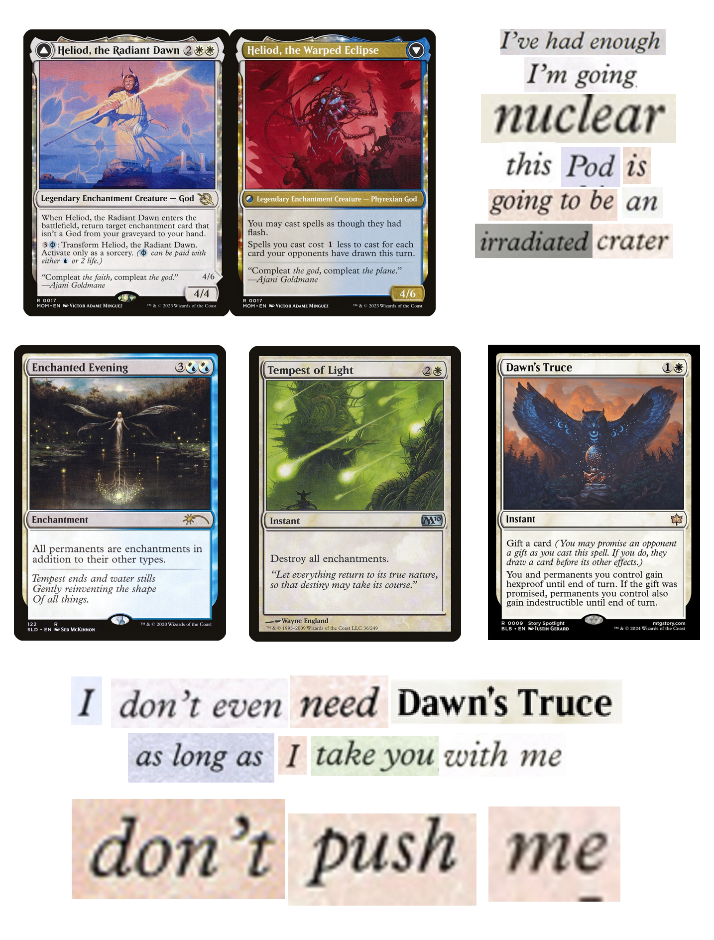 >>97581815Hybrid rule change should happen. Magic was not built to adhere to strict colors like this. The pie was balanced on the idea you could splash shit to get things your main color did not have. If I am in red then I just get to suck a fat fucking dick if someone plays an enchantment and I used my chaos warp. Commander runs contrary to the entire design of the color pie