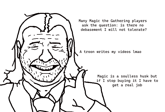 >>97582022>Isn't he extremely critical of sets? Like, he doesn't like UB as a concept,He literally word for word said "I don't want to yuck someone else's yum" and it became a meme for being an impotent faggot who is afraid to fight for his own opinions because other people might get upset.He buys collector boxes of every fucking set that comes out, UB or not. That's thousands of dollars he's handed to WotC for a product he claims to dislike.If he actually had a principled stance about UB he would say he's not buying it or talking about it and encourage his audience to do the same. But if he ever did that his channel would die because UB is more than 50% of all sets and he would rather keep his cushy "job" talking about Magic on the internet than stop supporting a company ruining his hobby and get a real job