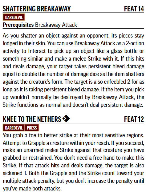 >>97584870>You need to be level 14 in Pathfinder to cut someone with a broken bottle.and deal multiple dice of persistent bleed damage as a bonus top the damage, effectively doubling your damage for at least one round and probably several more.>You need to be level 12 to kick someone in the balls.As part of a double attack that also inflicts a condition on the opponent at the same time with no extra penalty applied to the second attack, so you can suffer no penalties to either attack while also inflicting a condition.Disingenuous cunt.>>97586991"If you mix normal characters and mythic characters shit gets broken!"No fucking shit moron. that's why that is an option and not the norm.
