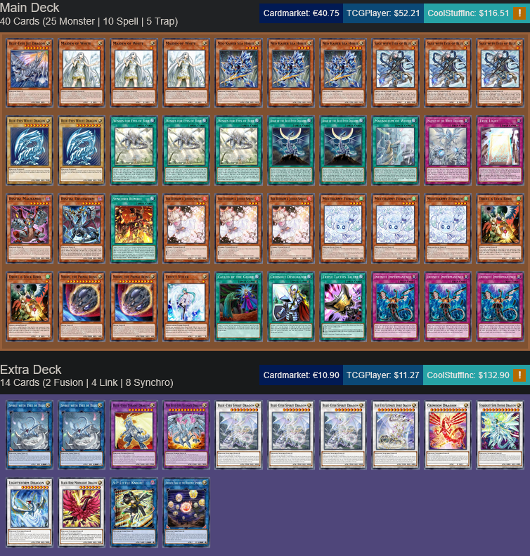 >>97594136you only need 2 bricc-eyes if you're not running kaibaman the legendroar is a 1-of in most builds, but some people like to run 2, either way it's not a 3-of, neither is majesty (1-of no matter the build)white stone is a waste, why do you wanna search the brick when you have a lot more ways to either add it or outright search it?ultimate fusion is also a 1-of if you're actually going to summon tyrant (also a 1-of) on the crackbackswap the ratios of the spirit dragons ie 2 link and 3 synchroeverything else looks fine for a blue-eyes deck with 3 structureslook into adding the crimson dragon package to your deck, it's only about $5 worth of cards and it massively improves your endboardbystials are also cheap as fuck now, 1 magnamhut and 1 druiswurm is all you really need