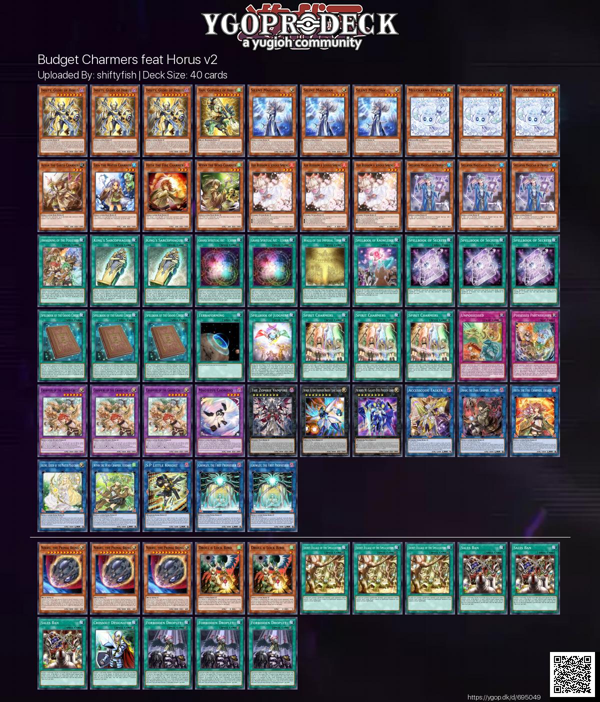 >>97627133I'd nix Spellbook of Knowledge, Grand Spiritual Art - Ichirin, and Unpossessed. They don't really do things that help the deck run to well in comparrison to other cards. DRNM should also go to the side deck. You only want that card when you are going second not in the main.If you don't want to replace them with handtraps, Droplets or Triple Tactics cards...>>97627109 does have a good point with Diabellstar.Going 3x WANTED: Seeker of Sinful Spoils, 3x Diabellstar the Black Witch, 1-2x Sinful Spoils Deception, 1x Azamia Debtors and replacing either Dharc or Underworld Goddess with 1x Azamina Ilia Silvia could be a good play.>>97627165I recommended the deck go hard on Horus because of Spellbook of the Grand Circle. If you only have 4 Charmers in deck, you NEED to get them out of your hand by whatever means you can get or else that card is completely dead since it has to search exactly 4 Charmers not up to 4 Charmers. Imsety, King's Sarcophagus, and Walls all do the right stuff to get rid of them from your hand to the places that Grand Circle can retrieve them, with Walls shuffling back Familiar Possessed into the deck.Trick Clown is less tan ideal, but across King's Sarc, Imsety, Spirit Charmers, and if they go for the abovementioned Diabellstar package, then that's about 16-17 ways to send it to the GY. If they nix Dharc for Ilia Silvia and then nix Underworld Goddess for a second Artemis, then it can also 1 card itself into Crowley in a desperate bid (NS Trick Clown, Link Artemis, Trick Clown revives itself).Silent Magician is also more fine than you think. It's summon condition is not a hard once per turn, and it's spell negate is also a soft once per turn. There's absolutely going to be leftover spellcasters somewhere, and she's an easy way to convert them to interaction even if there's multiple in-hand.