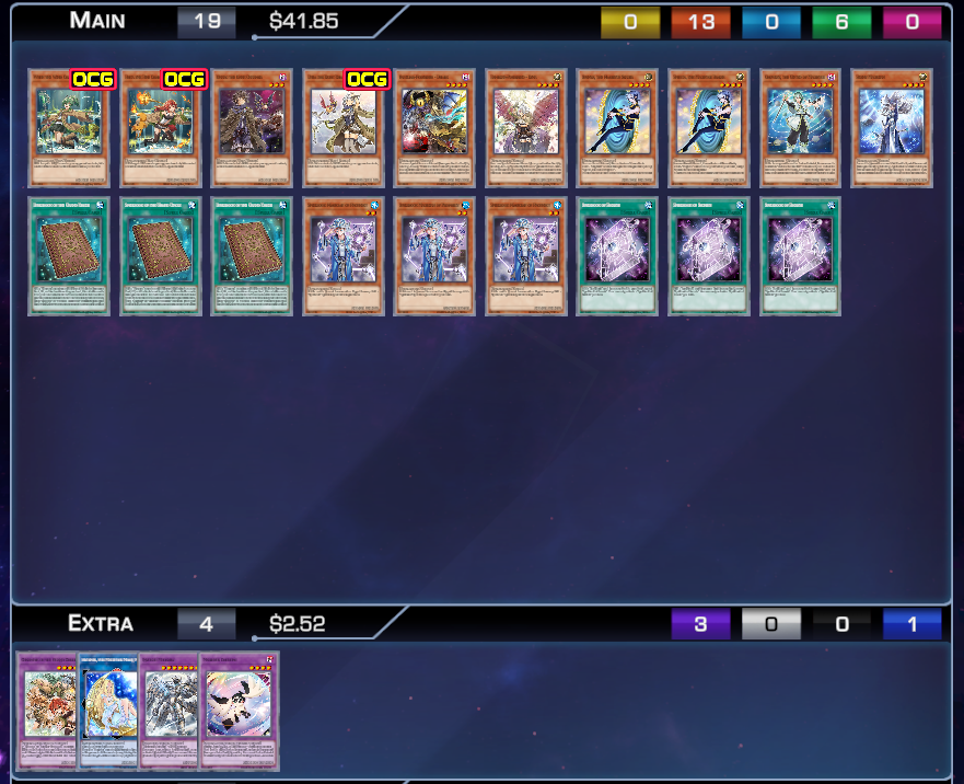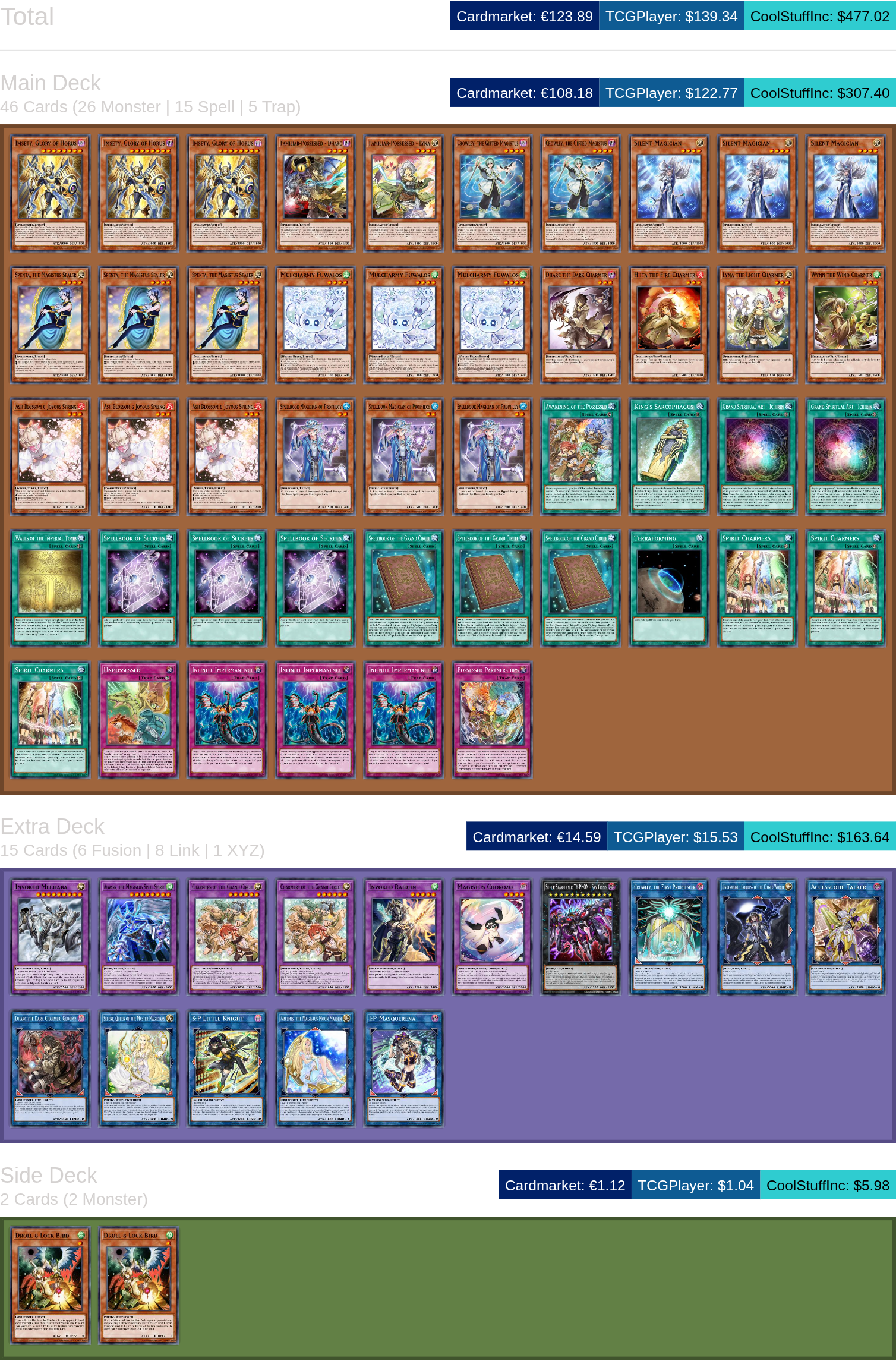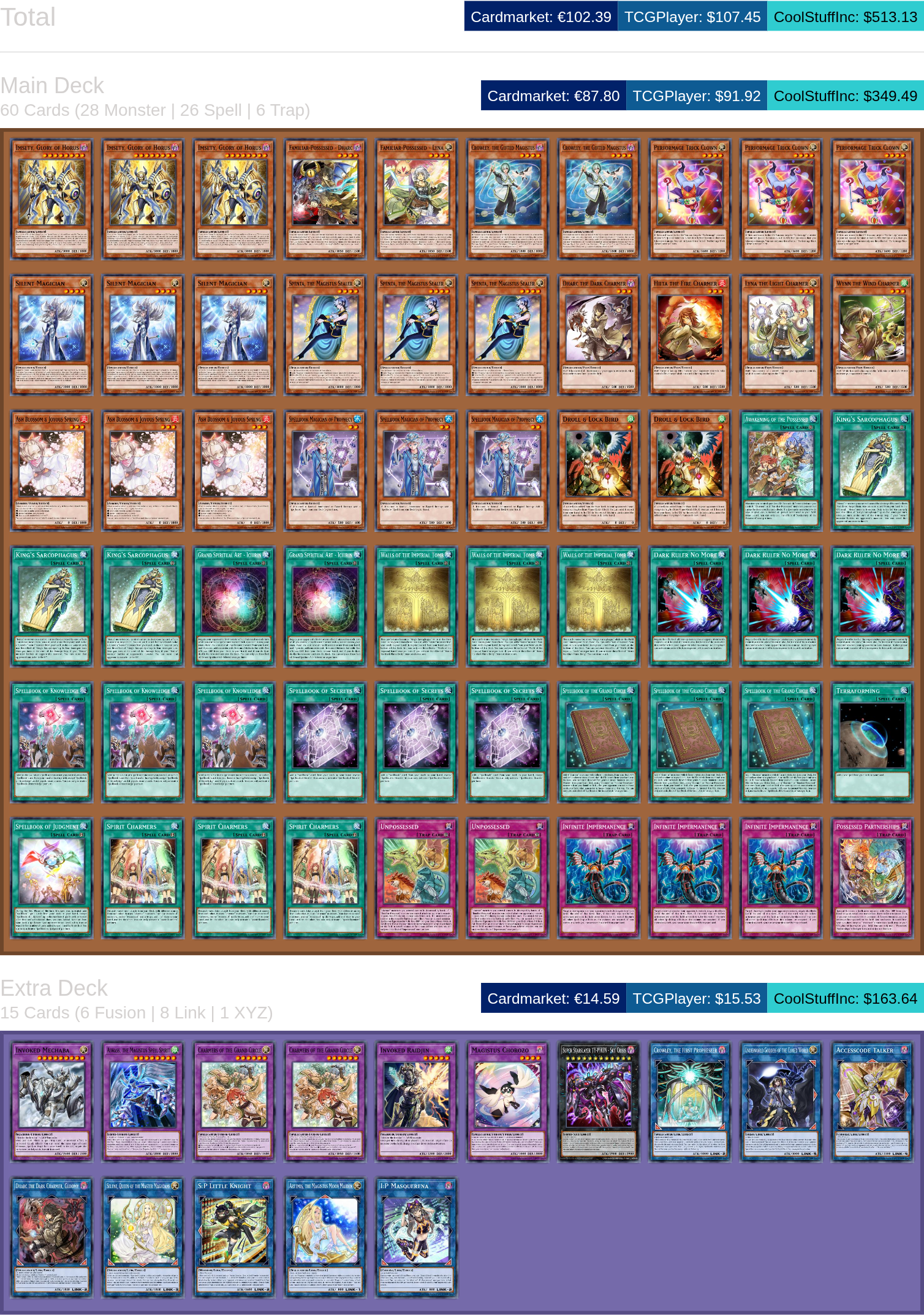 >>97626899To increase odds of not expending your normal summon even further, you could also add:>3x Elzette of the White Forest>3x Elzette, Azamina of the White ForestBut these are both going to end up pricier with basic Elzette being $5 a copy and Elzette Azamina being $12 a copy.>>97626875Fusion Spell 1 is Spellbook of the Grand CircleFusion Spell 2 is Crowley, the Gifted of Magistus's summon effect thanks to the Spenta search.You likely won't need a 3rd to come up, as once you go past >>97626374 then the preferred play would be to Special Silent Magician using one of the Charmers for a Spell negate and then link off Familiar Possessed - Dharc + other Charmer/Familiar Possessed - Lyna for I:P Masquerena (I:P using her effect on your opponent's turn to link off with either Silent Magician or the fusion monster to make S:P after one of them used their effects). There's other options to go yet further, but those end up a bit more dependent on what's lying around aside from the stuff that was mentioned.If you ever end up feeling the need for a third fusion at some point, then you just want to wait for Four Charmers in Profusion. It's effect would allow for you to revive Crowley on your opponent's turn alongside another Charmer to do another fusion then.>>97626954It is a possibility of being summoned with Spellbook of the Grand Circle. But I feel like your better bet for an ED would look more like:2 x Charmers of the Grand Circle1 x Magistus Chozoro1 x Artemis, the Magistus Moon Maiden1 x Invoked Mechaba1 x Invoked Raijin1 x Aiwass, the Magistus Spell Spirit1 x Crowley the First Propheseer1 x I:P Masquerena1 x S:P Little Knight1 x Selene, Queen of the Master Magicians1 x Accesscode Talker1 x Underworld Goddess of the Closed World1 x Super Starslayer - TY-PHON1 x ED Link-2 Charmer with favorable attributesWhile Quintet is hard to out, Lunalight being in the format means people are running outs to Towers monsters like it.