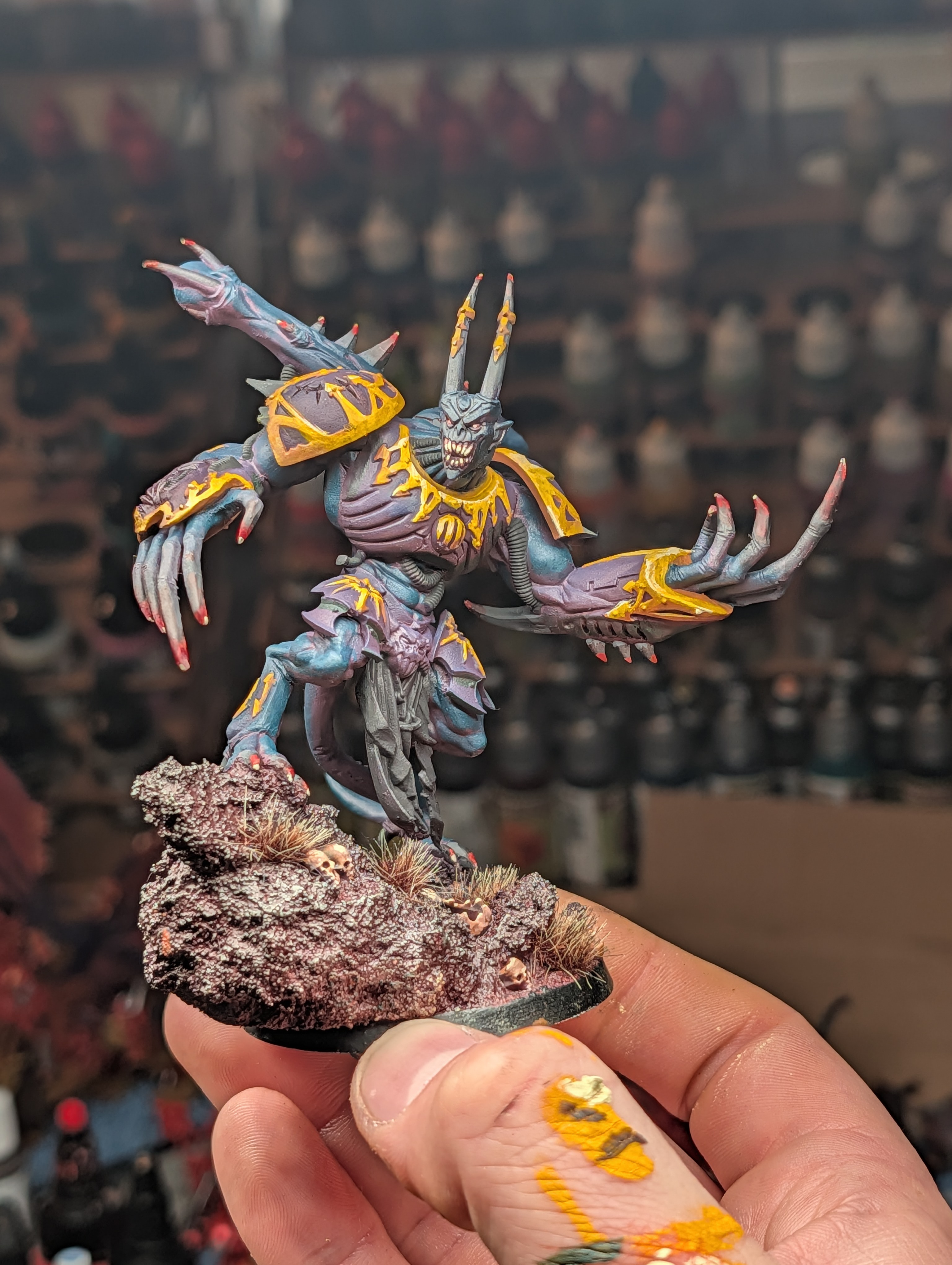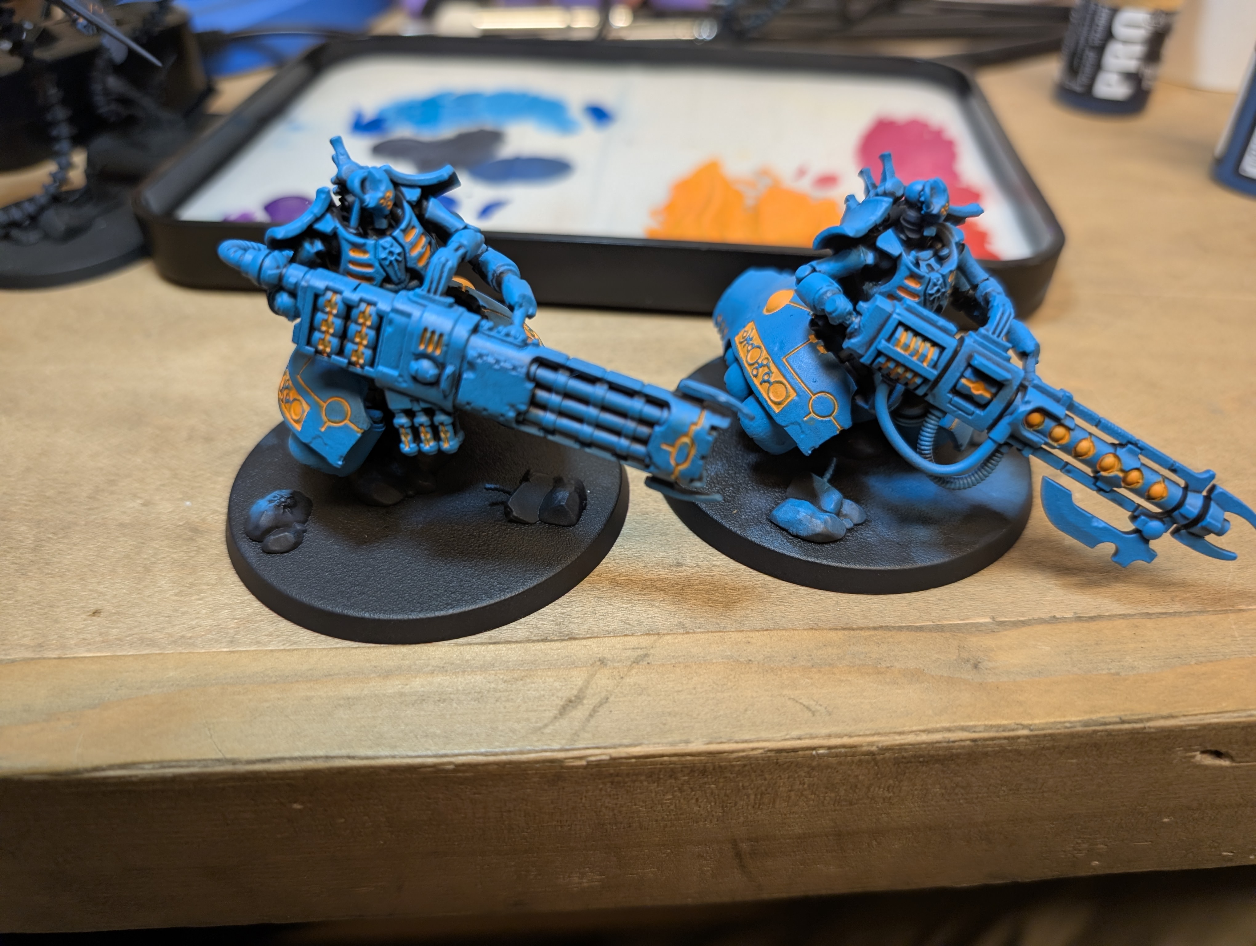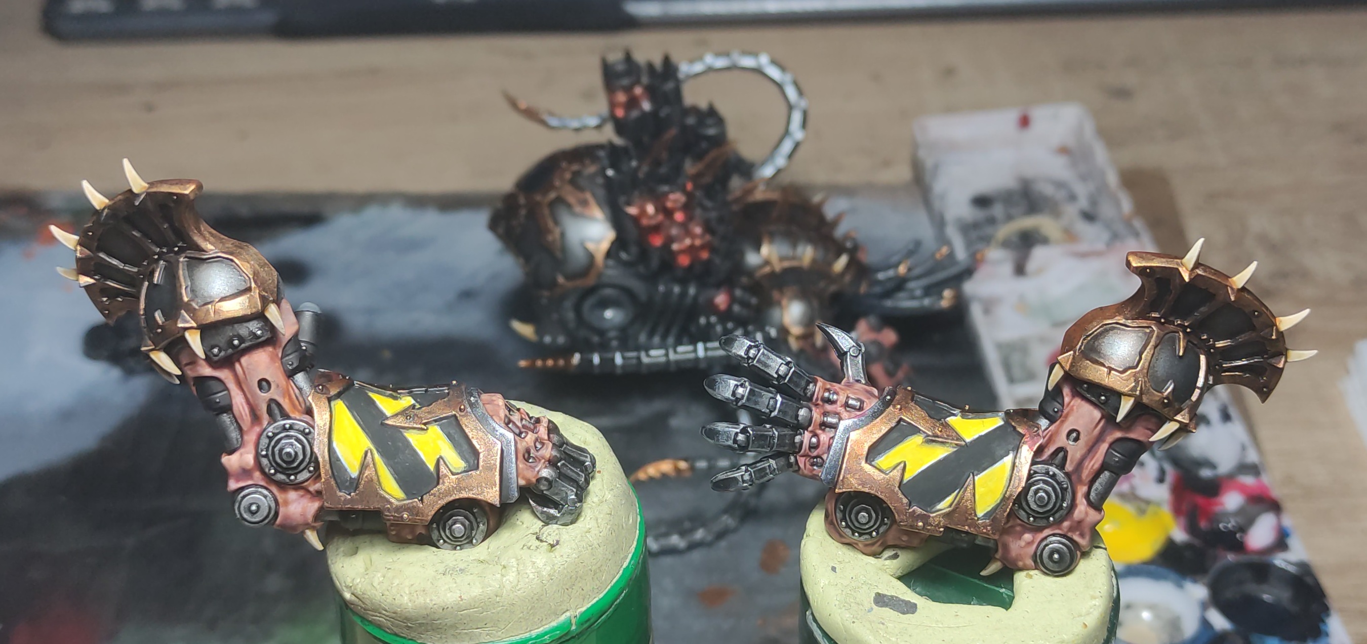 Moving on with this box now that my Skorpekhs are done. Quick WIP image of the Lokust Heavy Destroyers. Still gotta get some pink and red on the yellow