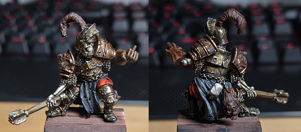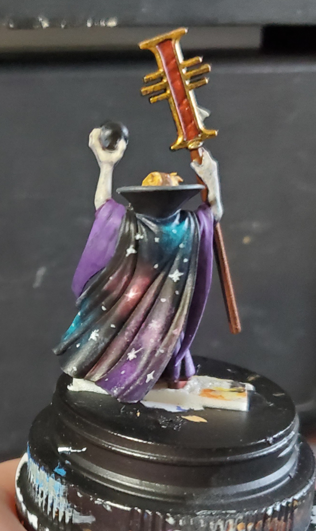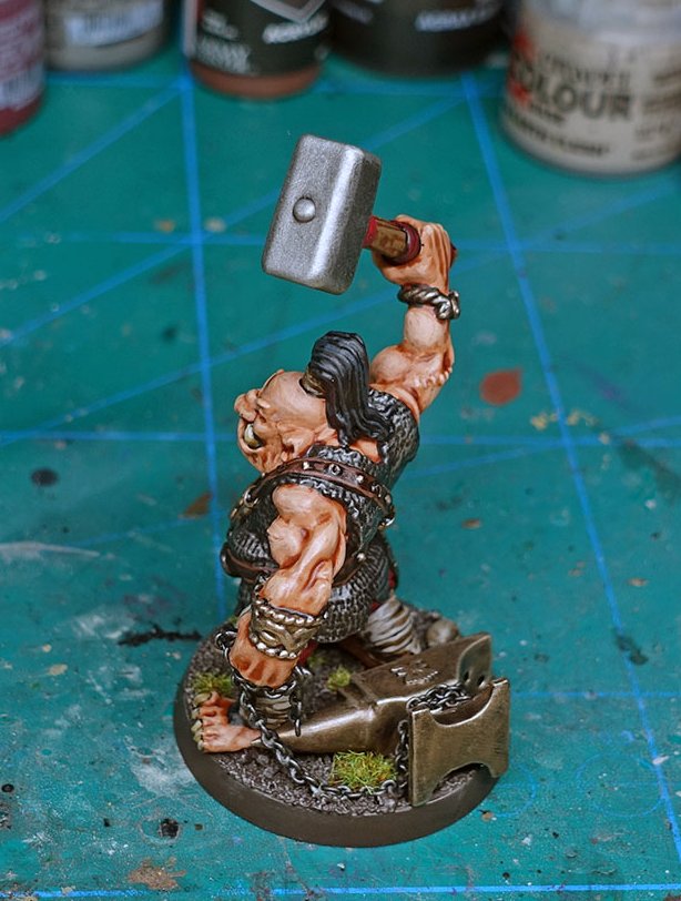 now i have to paint a bicep, half a robe, the front portion of a jaw and maybe a foot, then paint a back of robe, remainder of jaw, hand (the other one) and entire2 handed weapon, then face, both legs, one arm and backpack as a third peice.