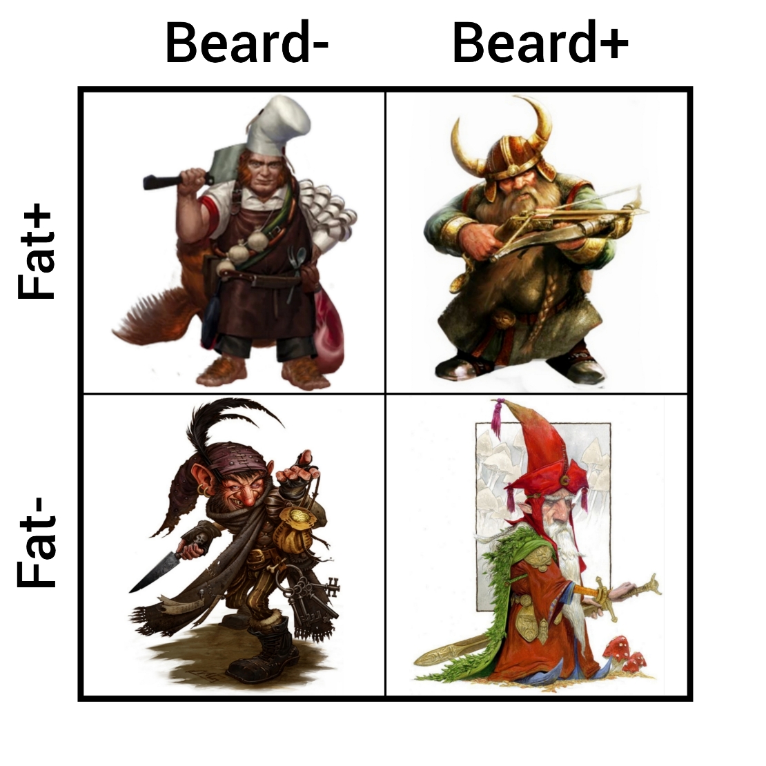 >>97594953consult the chart>fat and beard = dwarf>fat and no beard = halfling (practically a small Imperial ogre)>beard and no fat = gnome (practically a small college wizard)>neither fat or beard = gnother type of gnome (practically a pink goblin)