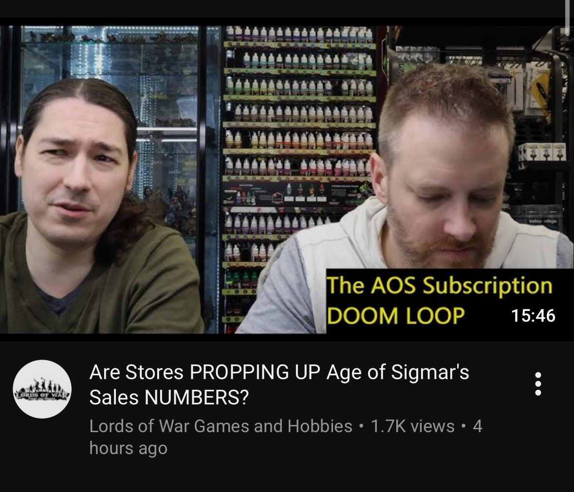 >>97605884Decided to give this a watch and save you all a click, it's just complaining that most releases aren't actually new shit and is just old models repackaged in discount boxes (battleforces, spearhead/combat patrol, regiments of renown) that aren't as interesting for the average customer. As a store though you can't just order the new models alone you gotta take the shitty repackaged boxes too which is kind of an asshole move by gw but makes sense.Anyhow since they just revealed two more 40k combat patrols with the ancient rhino kit in them I assume these are hardly aos specific problems.That'll be the first and last of these I watch because good lord these two are hard to listen to so fucking boring. No wonder their whole channel is just "IS 40K DYING??", "AOS LOSING CUSTOMERS??" and "TOW IN DEATH SPIRAL?" on repeat. also do youtubers get money if you watch a vid with adblock on or is it like a per ad thing? I don't actually know