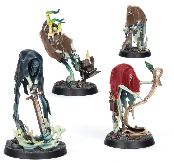 Thinking of something more interesting than a basic Nighthaunt scheme for these guys. So far I'm thinking of leaving the executioner in black, having the scrivener in red since he's the closest thing to a judge here, and the sharpener and block bearer in brown since they're more of laborers/lower class.Any other suggestions for how I can spice things up with this warband? Maybe a color other than spectral blue/green for the under part.