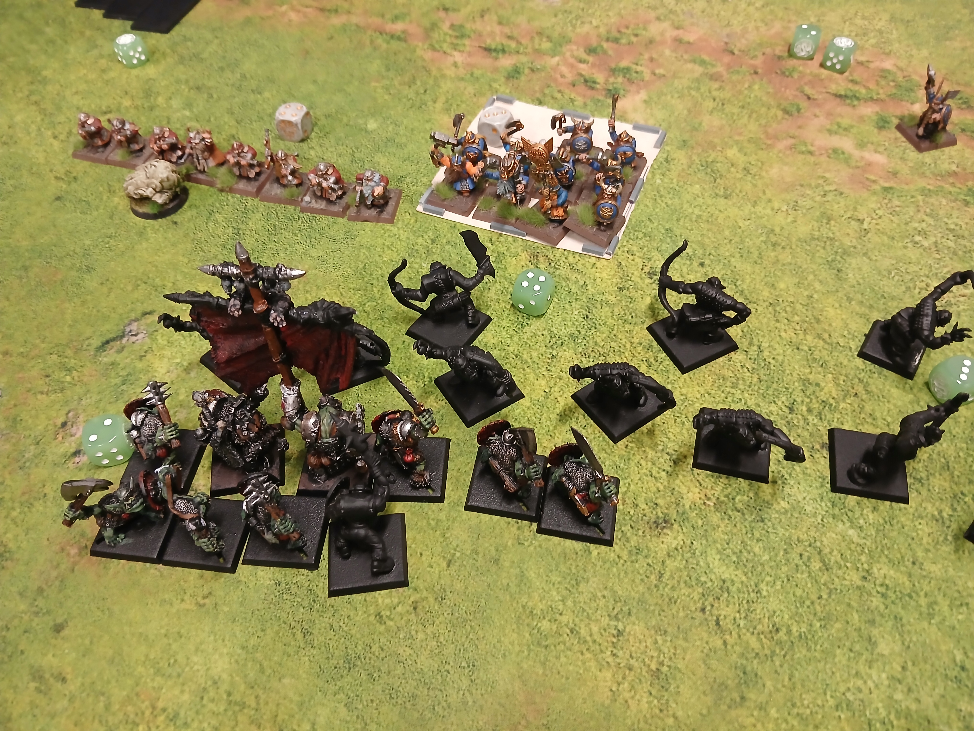 Great game vs Dwarfs for path to glory game 2 today at 500 points. Highlights include:- Dwarf slayers held unit of 16 orcs and 4 boar boyz for nearly 4/5 turns before dying. They held the dwarfen right flank the entire game and wiped the boars. - Snagrog, my general duelled and killed the Dwarf King general (only hand weapon) over 2-3 combats. Thunderers and Warriors finally broke big uns who escaped and rallied. Mad lucky but my Big Boss din't let me down.Definitely enjoying learning Orcs. The only units wiped were the slayers and boars, rest of each others armies were intact with a few losses in the dwarf warriors and big uns. I am preferring orcs more and more to Chaos. Less raw power but nice grindy dynamic.