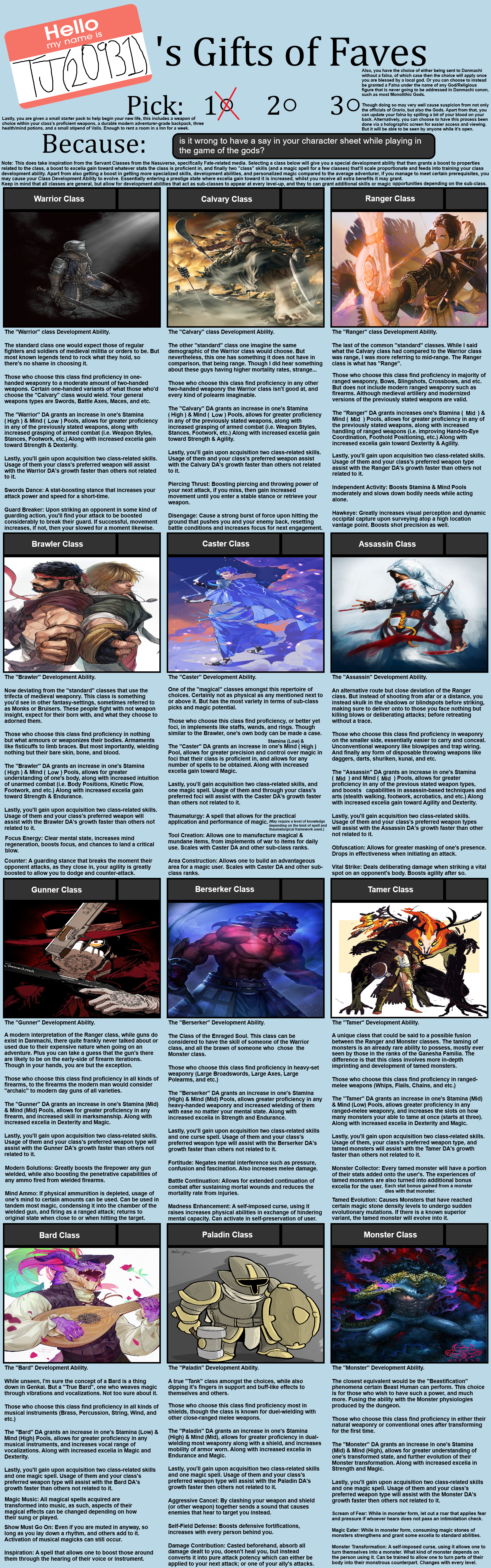 >>97604939>Adventurer>Mixed (Human/Dwarf)>Multiplayer>Survival* x2>Tactics>Magic Armor>Dexterity>Magic>Endurance>Level Up>Hunter>Tamer>Armory>Mystery>Smithing>Courage>Prime>Taunt>Voice>Reflect>Canon God (Goibniu)I don't really care for this one. I tend to agree that shonen (and to a lesser extent any franchise) CYOAs are boring. That being said, I thought I'd give it a shot, since I do sometimes enjoy off-the-wall builds for these that mostly disregard the source material. This was built around the idea of a kind of mix of Trojan horse/puppetry/lion dance/trapping. This guy will create a modular "exoskeleton" that can accommodate multiple party members, layers of armor, skins, scent gland receptacles, ports for "swarm" puppets, and so on. Basically the goal is to either ingratiate ourselves to or intimidate dungeon inhabitants by posing as monsters, and failing that to use the structure as sort of a tank. Maybe this could also be folded into collecting rare ingredients from them