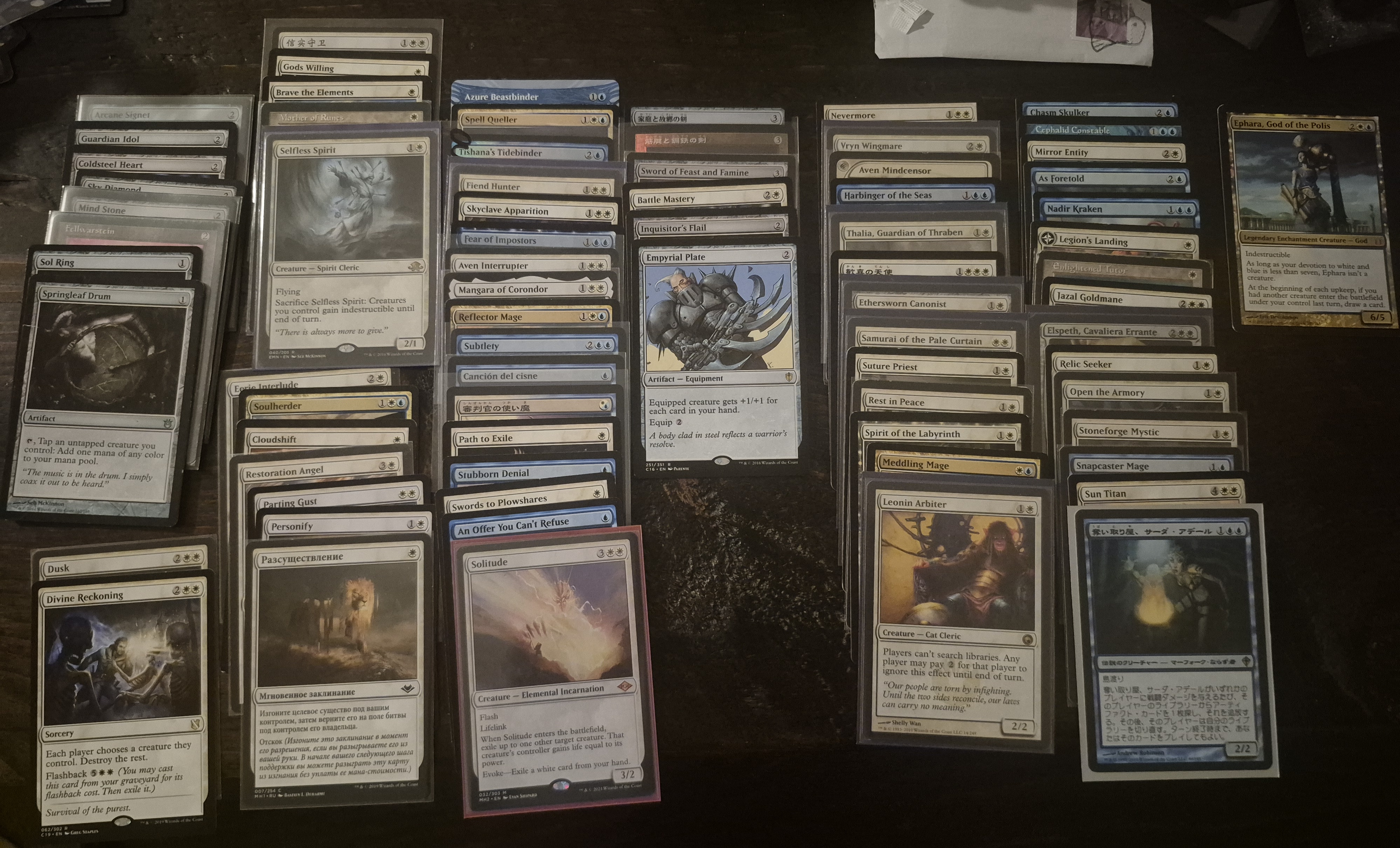 What would you cut here? Feel like I need 34-5 lands, so 7-8 cuts.Non-english cards are from left to right, top to bottom: fellwar stone, guardians of faith, ephemerate, swan song, judge's familiar, sword of hearth and home, sword of sinew and steel, angel of jubilation, elspeth, knight-errant, and thada adel.