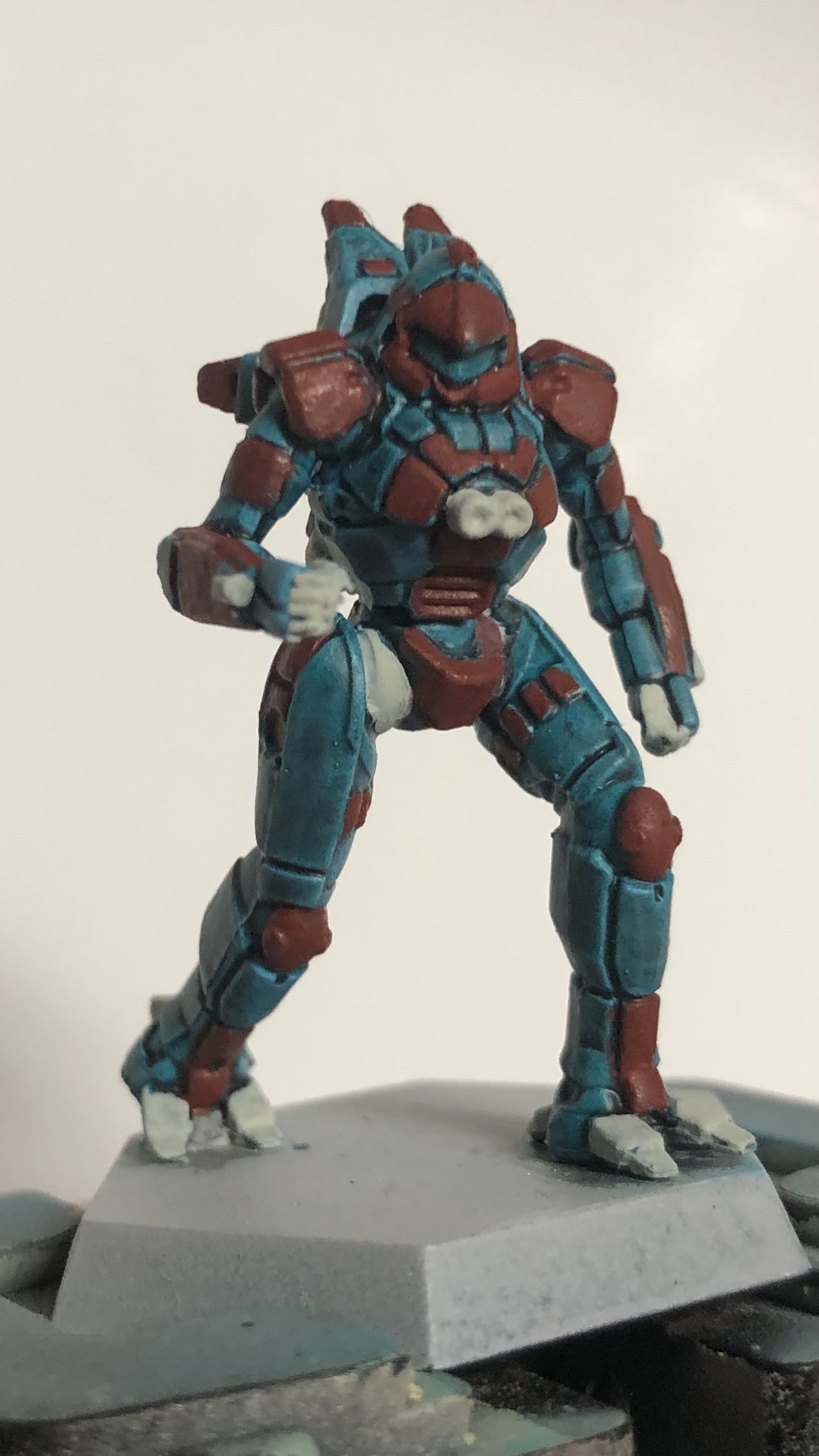 >>97613707>>97613744Thanks! I can always find a tone of problems in pics. But this is just blocking in colors. The buttery grey will be silver and will then get a second wash. The main torquoise already got a black wash and went way dark. I will go back and highlight the turquoise and red after the silver is on and washed.