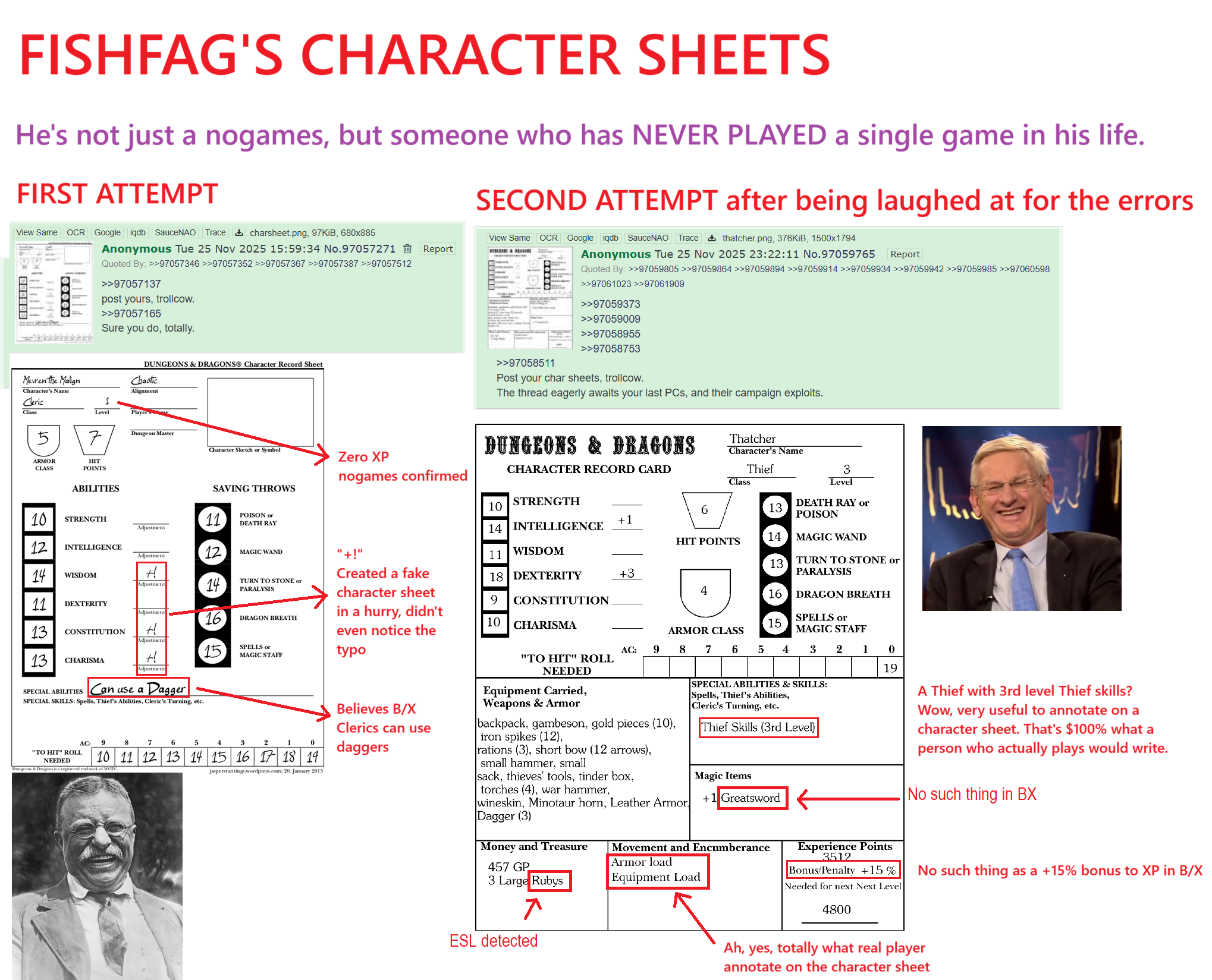 Kill yourself or post another fake character sheet for us to laugh at.