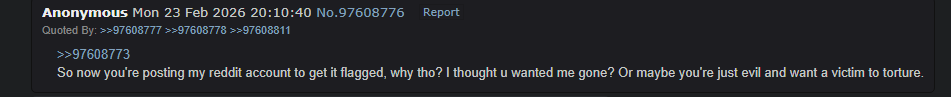 >>97619819You've spent 6 months insisting there's a cabal of bio wimmen in a discord coordinating harassment of youAnd you flipflop between the mods being in on the conspiracy against you or being totally on your sideYou are a textbook schizophrenic