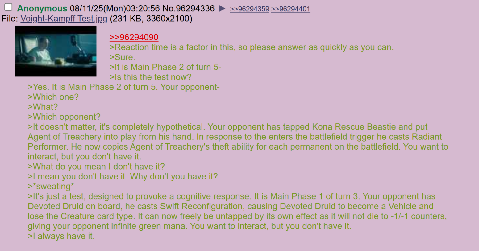 >guy who keeps board wiping keeps whining that his sanguine blood combo pieces keep getting exiled because he’s against 3 green >actually pouts when reanimating skeleton and gravecrawler get swords>uses board wipe #6 and complains the game is taking too long (2 hours)>cast pic rel and remove every wincon/high value pieces and the rest of his board wipes left in his deck>he actually starts to tear up and scoopHave you ever defeated someone spiritually/mentally?