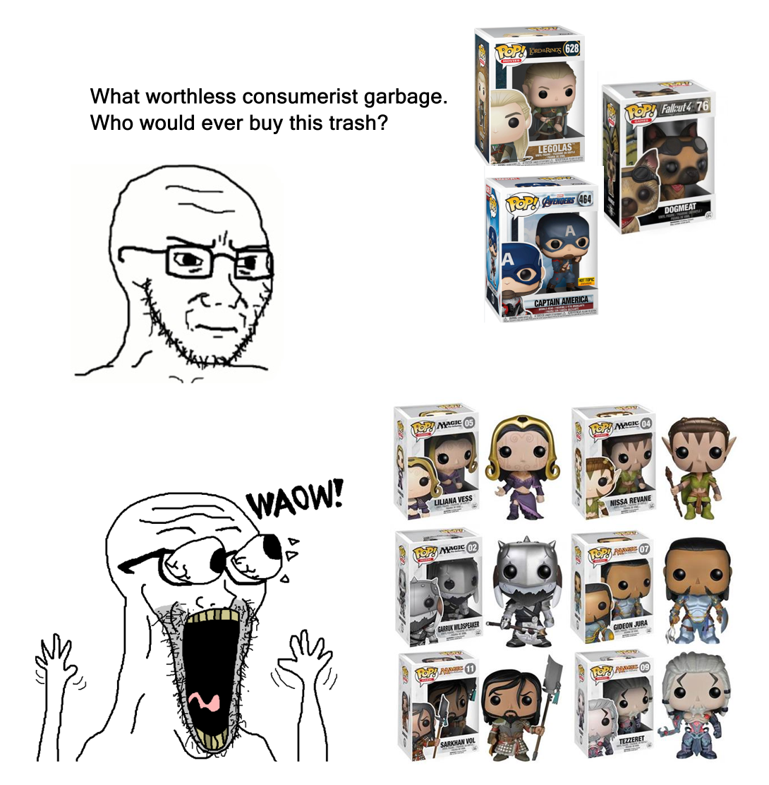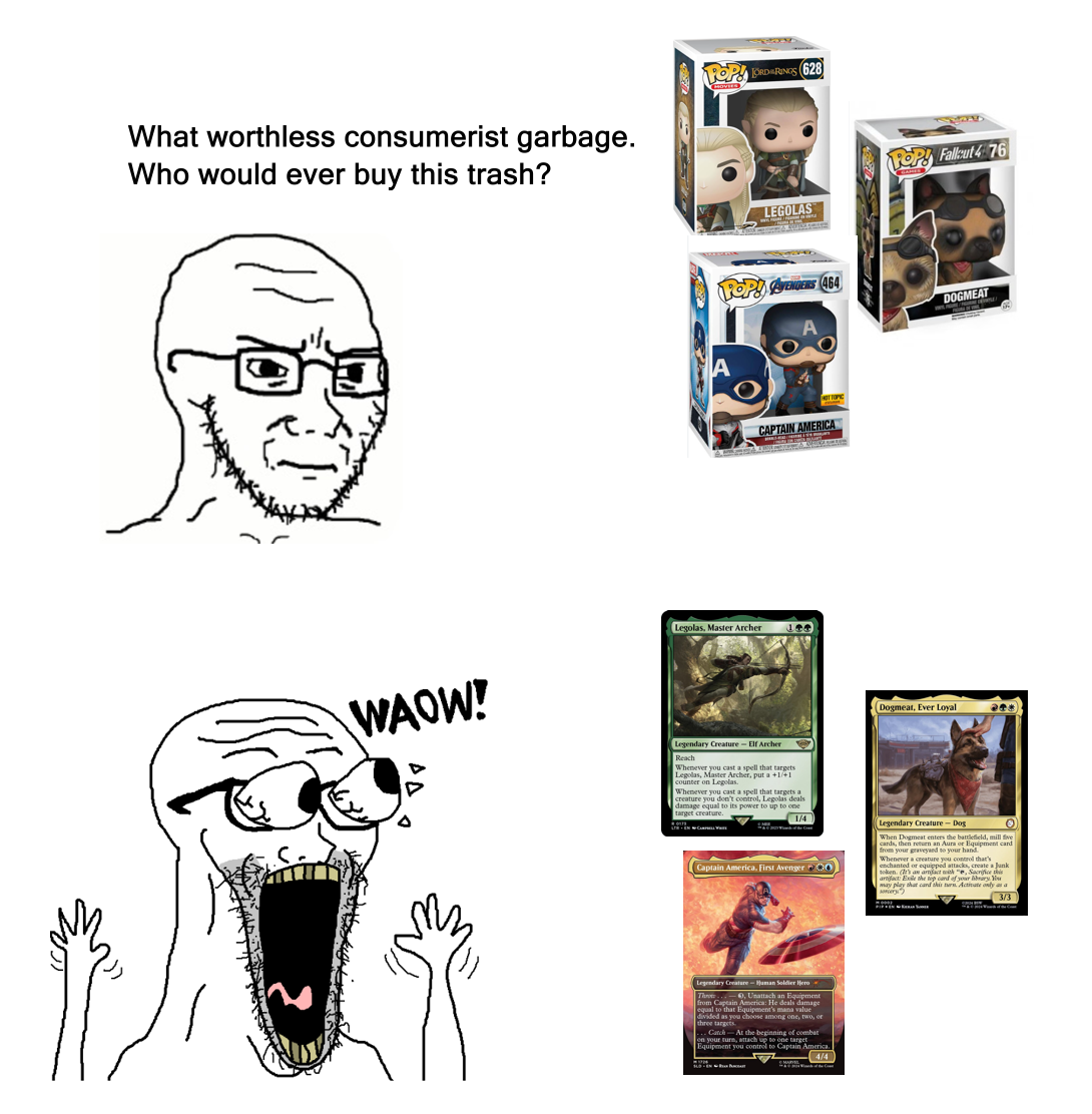 >>97628370Most of the discourse in itt thread about proxies is not actually about proxies, it's about people buying and using counterfeit cards from China and saying one is smarter for doing so and that the counterfeits are, in fact, real cards, and they won't shut up about it because they are so hellbent on seeking validation for their actions .Which is tranny levels of reality denial.The reality is, no one cares about proxies. The likelihood of someone at an LGS refusing to play with you if you have proxies in your deck when you are honest about it, are slim to none. Hell, CEDH basically only exists because it's unsanctioned format so it doesn't have to abide by the official MTG competitive rules that state every card in a deck must be legitimate and the format would probably die over night if WotC sanctioned it.So ask yourself, what kind of person does one need to be, to be dishonest about the authenticity of their cardboard in a format that doesn't care about the authenticity of their cardboard, and you'll understand why this general devolves every time proxy is used in place of counterfeit. Mentally ill people desperately seeking validation.